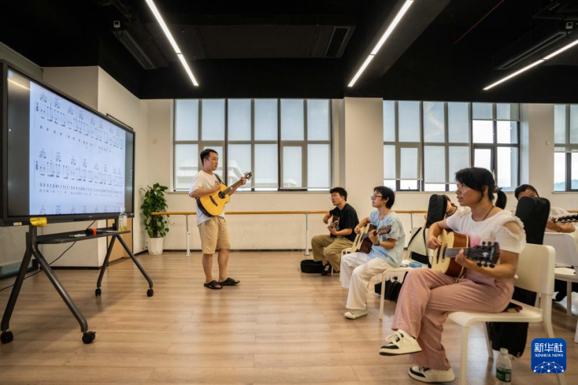The photo, taken on July 9, shows a teacher (1st L) teaching guitar-playing techniques at the Hunan Xiangjiang New Area Cultural Center. (Photo/Chen Sihan, Xinhua)