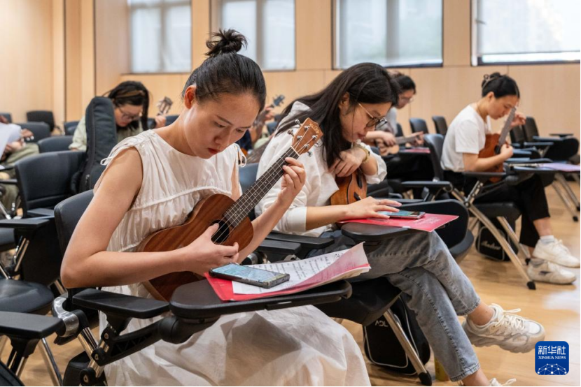 The photo, taken on July 9, shows students practicing the ukulele at the Hunan Xiangjiang New Area Cultural Center. (Photo/Chen Sihan, Xinhua)