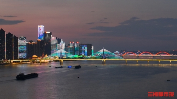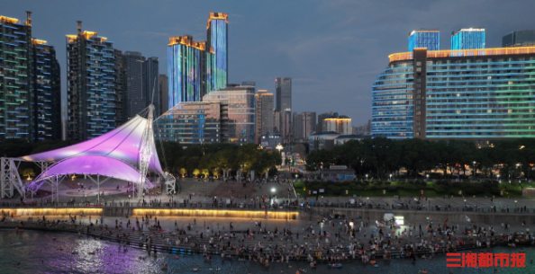 夏夜,长沙。湘江的水面上晃着灯光的倒影,水边散步的人恍惚以为踩进了马尔代夫的浪。这一刻,长沙的夜把浪漫调成了海滨模式。 提醒在水边散步游玩的市民游客,注意安全,做好防护,尤其不要擅自下水,野泳危险。(顾荣 摄)