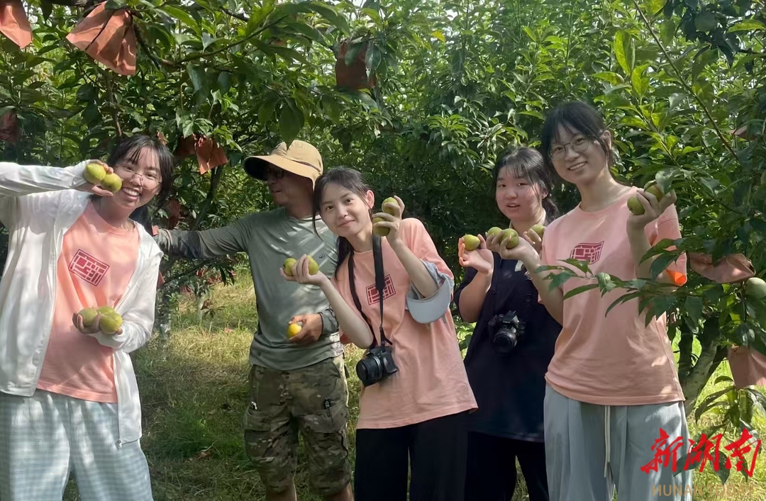 果园深处的黄金李园区,藏着份不期而遇的惊喜。刘师傅教我们挑果子要选“光照足、手感微软”的,说这样的才够甜。队员们散在果树下细细挑选,指尖触到果子时,还能感受到阳光留下的温热。见我们对着果子端详不停,他笑着点头示意——这些没打农药的果子,尽可放心尝。大家听了,纷纷伸手采摘品尝,不一会儿,袋子就被填得满满当当。
