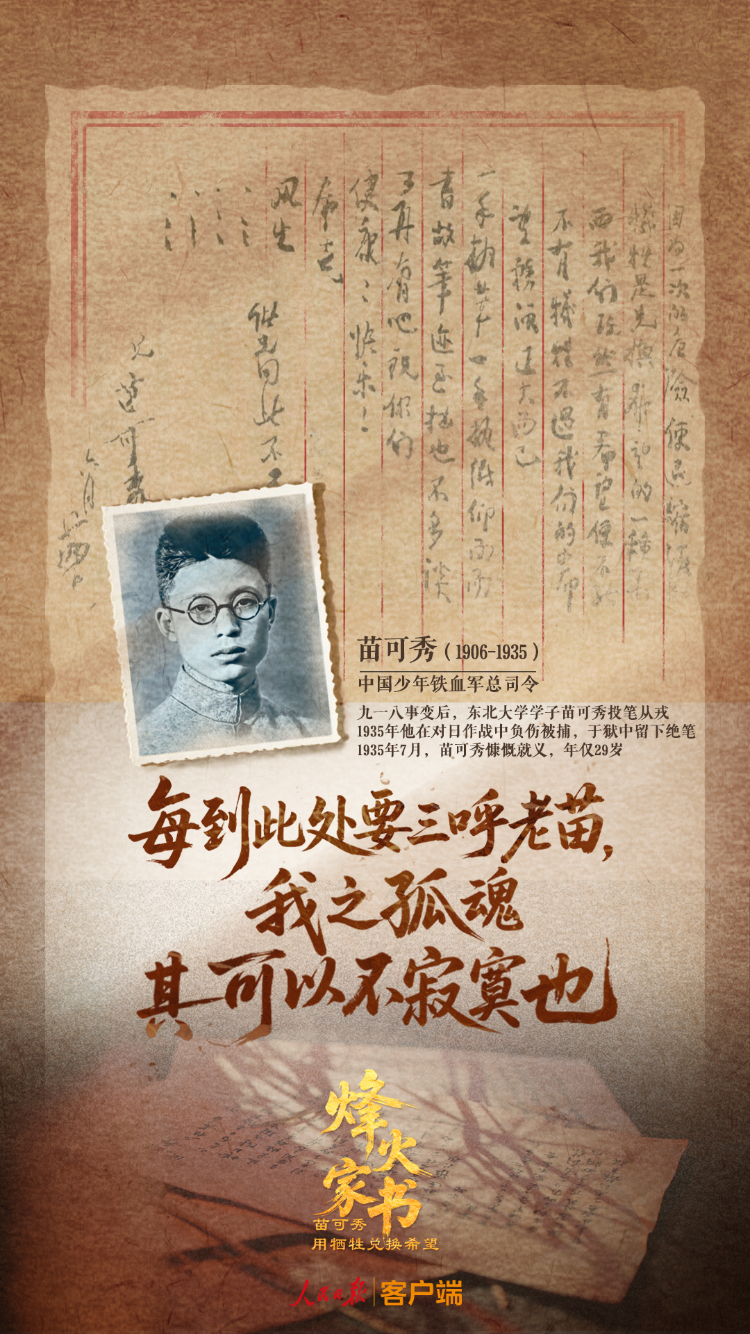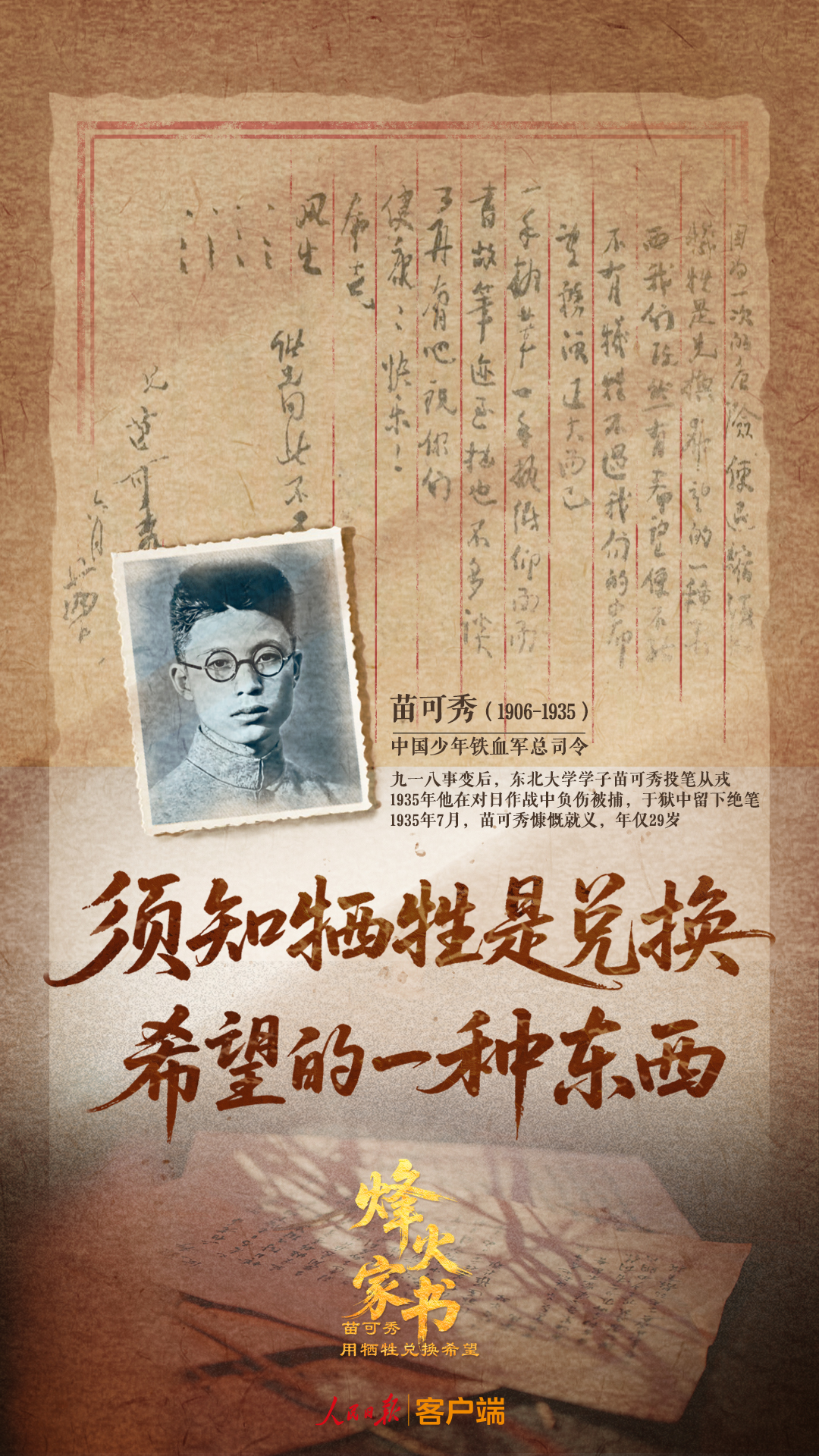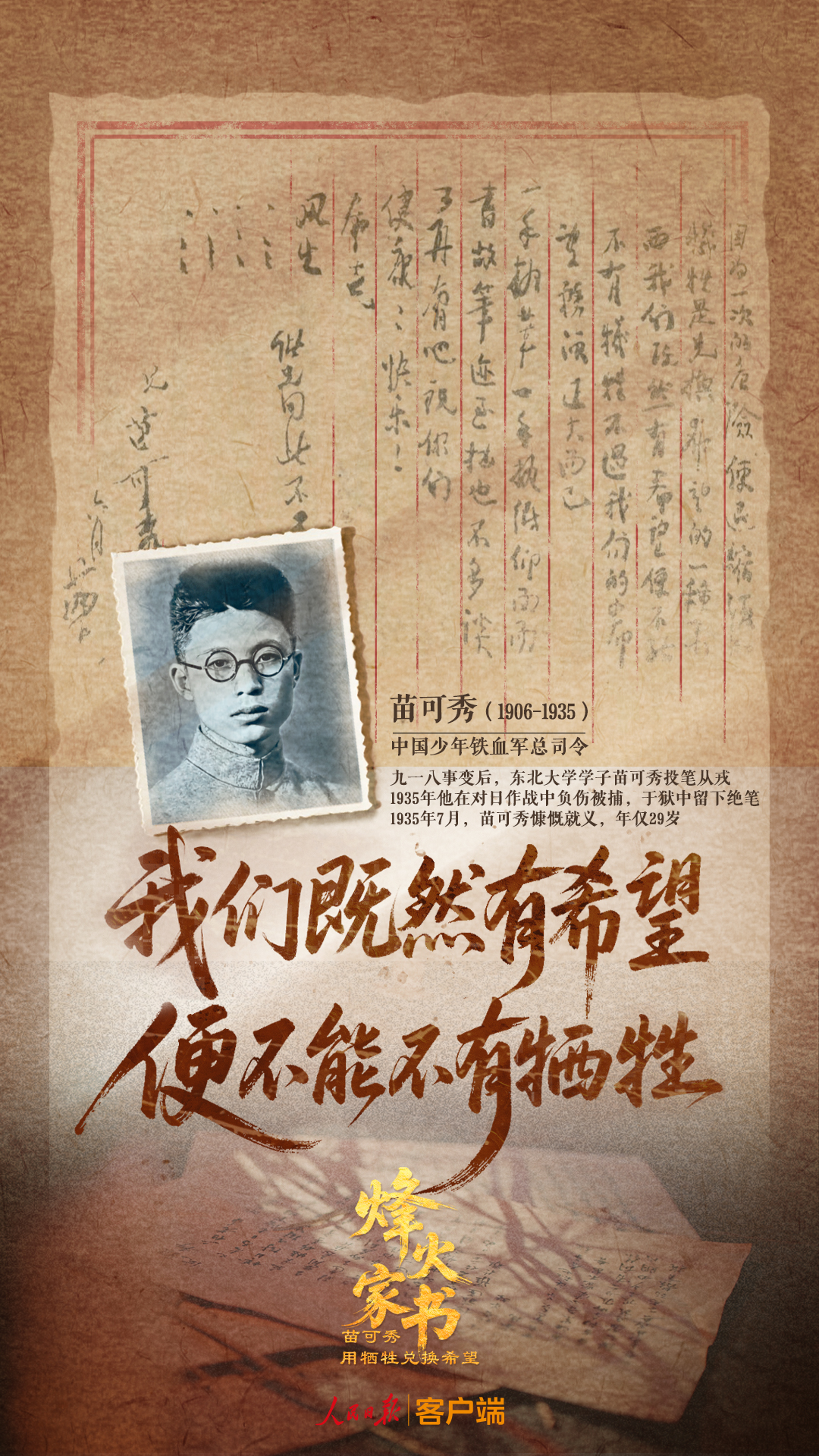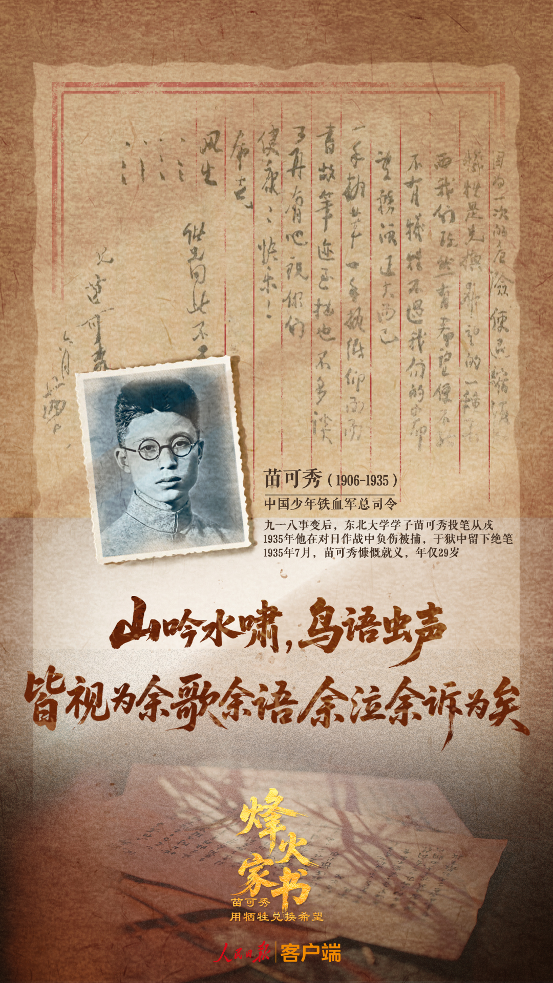 “须知牺牲是兑换希望的一种东西,我们既然有希望,便不能不有牺牲”“山吟水啸,鸟语虫声,皆视为余歌余语余泣余诉为矣”……九一八事变后,东北大学学子苗可秀投笔从戎。1935年他在对日作战中负伤被捕,于狱中留下绝笔,字字句句写满深深的眷恋,也映照着不屈精神与报国之心。