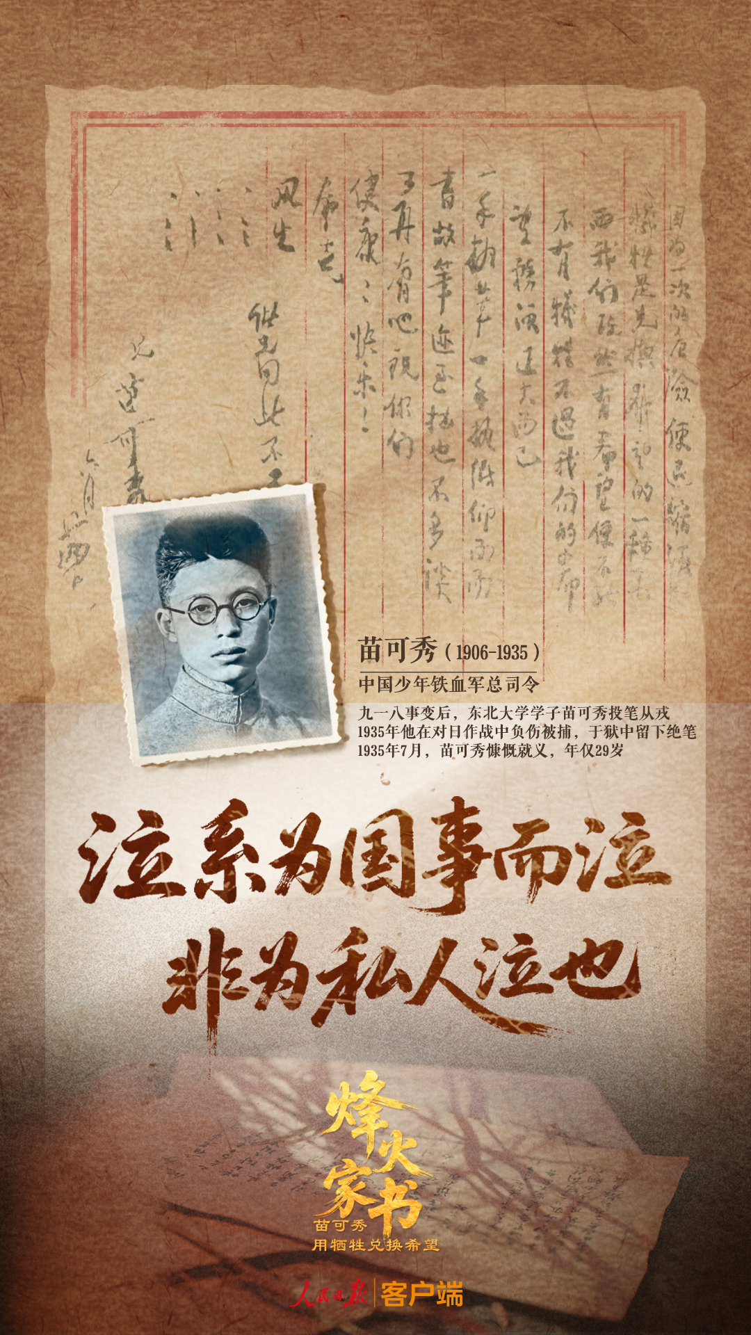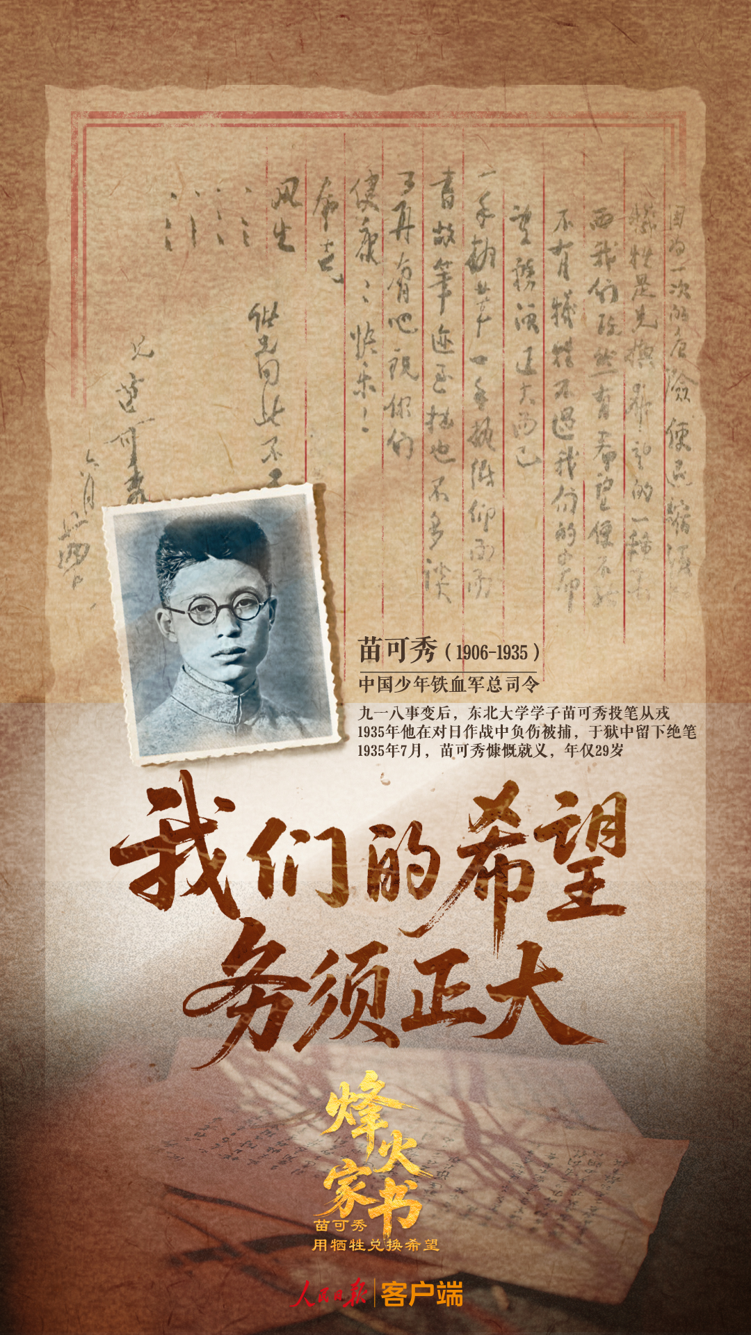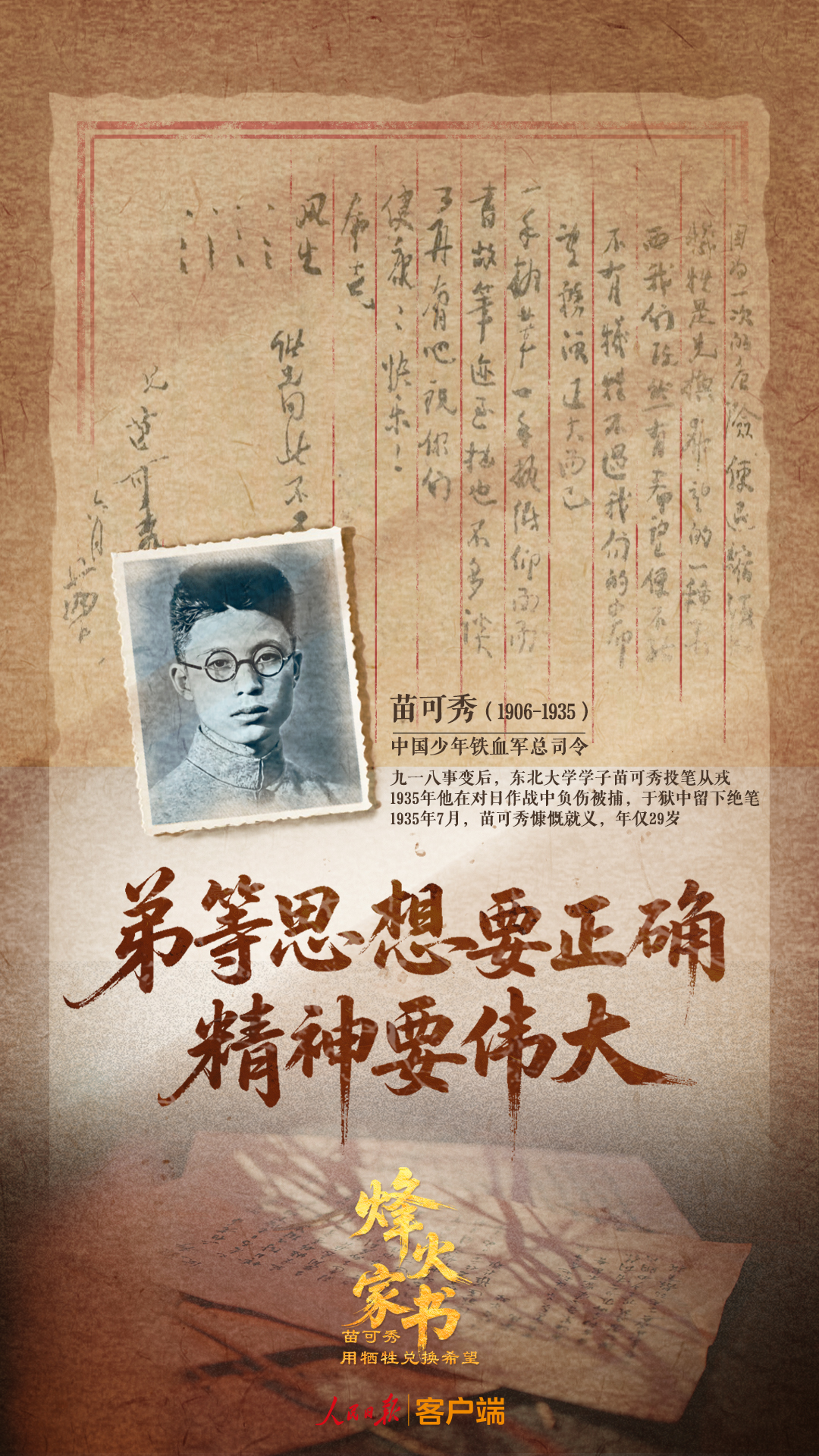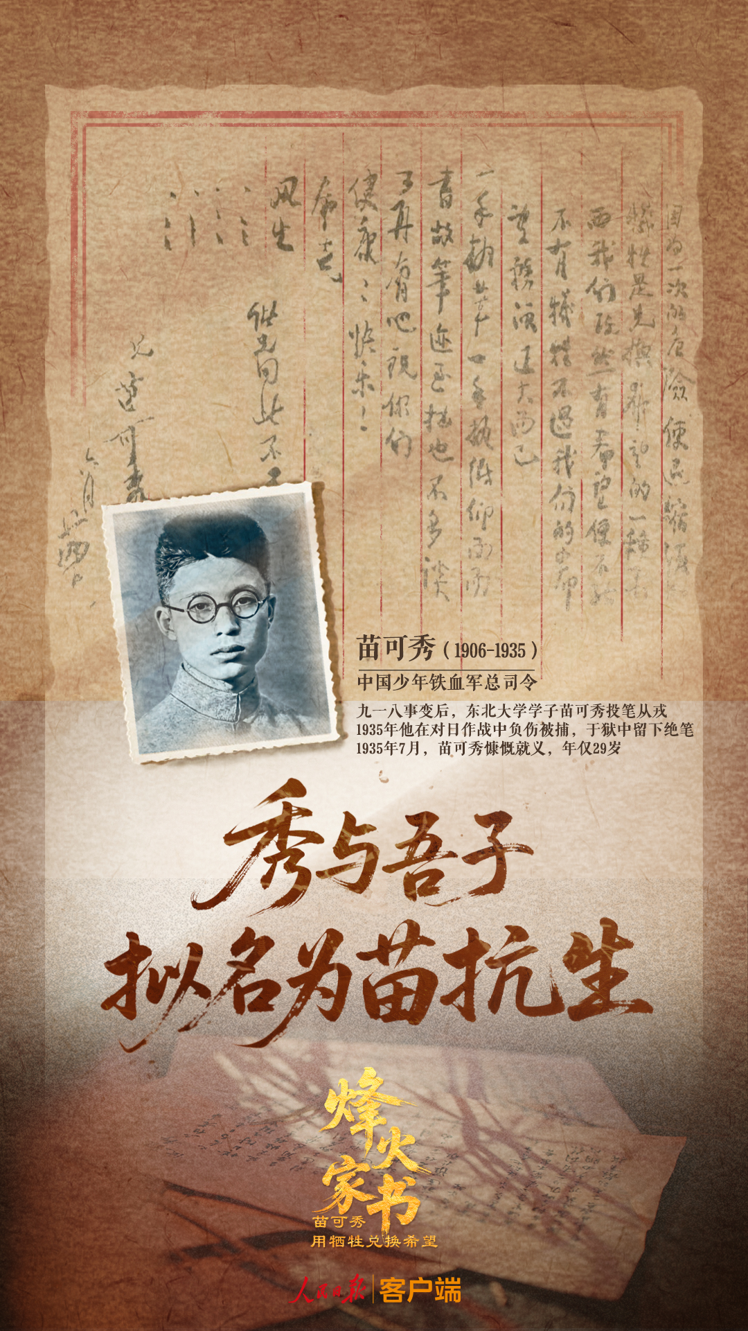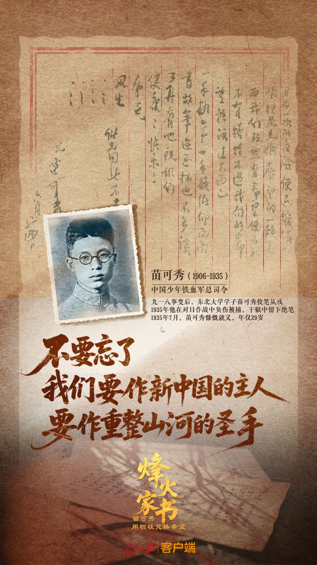 “须知牺牲是兑换希望的一种东西,我们既然有希望,便不能不有牺牲”“山吟水啸,鸟语虫声,皆视为余歌余语余泣余诉为矣”……九一八事变后,东北大学学子苗可秀投笔从戎。1935年他在对日作战中负伤被捕,于狱中留下绝笔,字字句句写满深深的眷恋,也映照着不屈精神与报国之心。