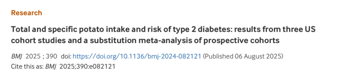 ①Total and specific potato intake and risk of type 2 diabetes: results from three US cohort studies and a substitution meta-analysis of prospective cohorts.BMJ 2025.