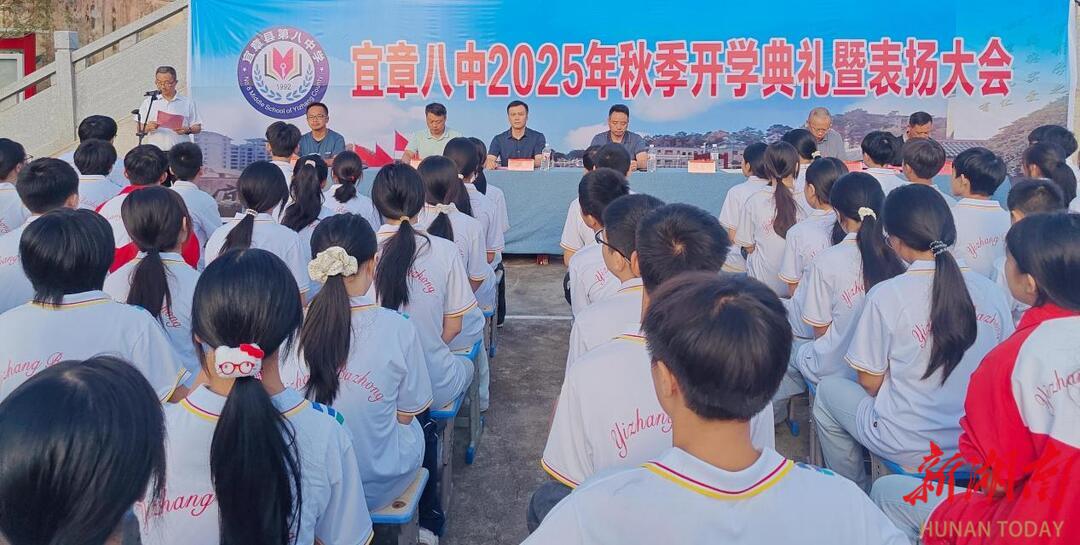 华声在线9月11日讯(通讯员 彭瑞洲 姚丹)9月10日上午,宜章县第八中学举行“金风润桃李,尊师颂初心”2025年秋季开学典礼。大会宣读表彰决定,共1002名师生获誉。涵盖“优秀教育工作者”“优秀班主任”“优秀教师”“学习标兵”“三好学生”“进步之星”“优秀学生会干部”“优秀运动员”等多个荣誉称号。