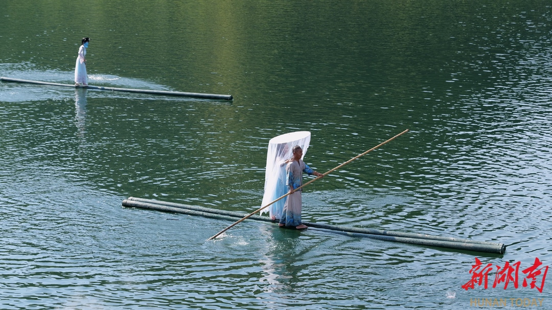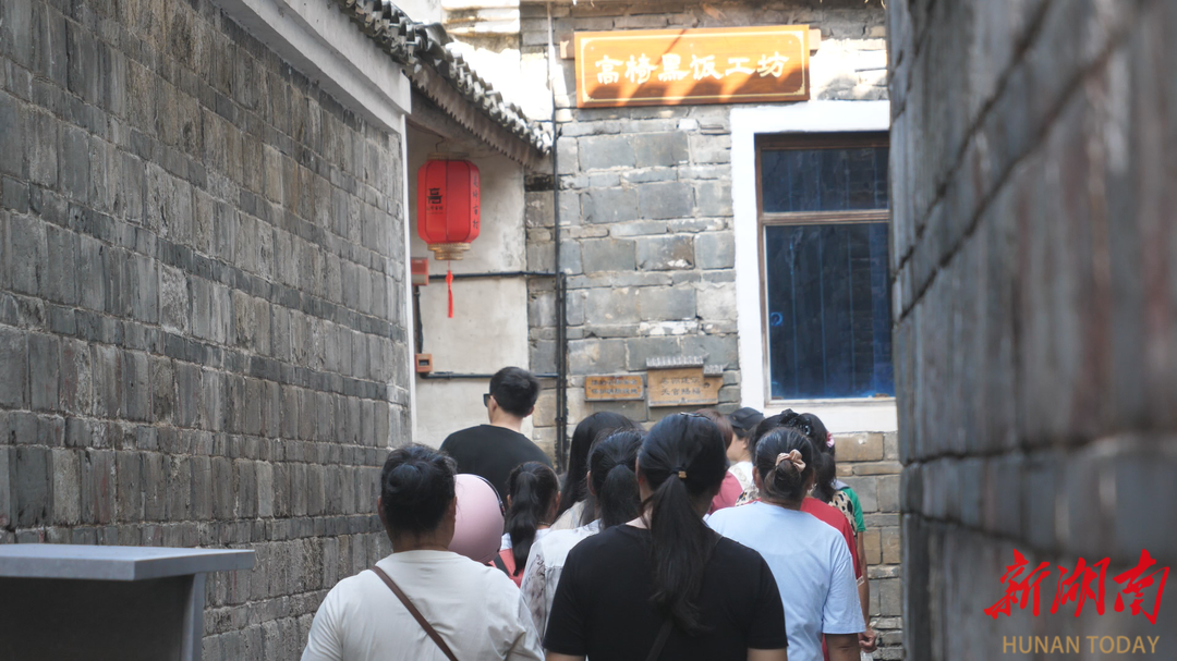 车队抵达时,古村入口处已是一片欢腾。侗族姑娘身着银饰盛装,随《迎宾鼓乐》节奏击响迎宾鼓,鼓点由缓至急,动作整齐划一。独竹漂演员身披蓑衣、头戴斗笠,踩着竹竿凌波入水,引得游客纷纷驻足拍摄。主街入口处,等待进入古村的游客排起长队,身穿侗族盛装的村民手捧碗碗米酒热情欢迎四方来客,糯米酒香随山歌飘散,现场热闹非凡。穿过古村门牌,红黑鱼池畔的阁楼上,汉服舞者轻倚窗棂,水袖随池中锦鲤摆动翩跹起舞;清白世家内,游客们围坐品尝现蒸的高椅黑饭与乌米粽,软糯清香中透出非遗技艺的匠心。