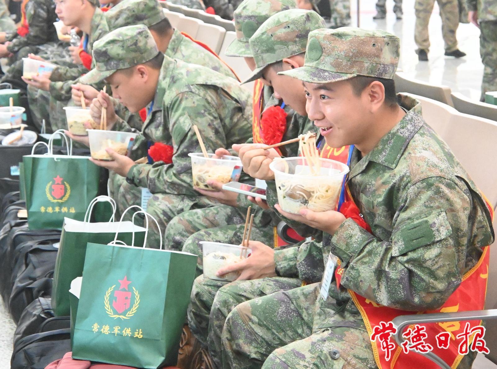 “马上就要离开家乡了,能吃到这碗家乡的牛肉粉,感觉特别温暖。”9月16日清晨,在常德火车站候车大厅,来自澧县的新兵吴承林一边吃着热气腾腾的米粉,一边感慨道。当天,常德各县市区500余名新兵身着迷彩、胸佩红花,精神抖擞地集结于此,即将启程奔赴军营,开启崭新的军旅生涯。