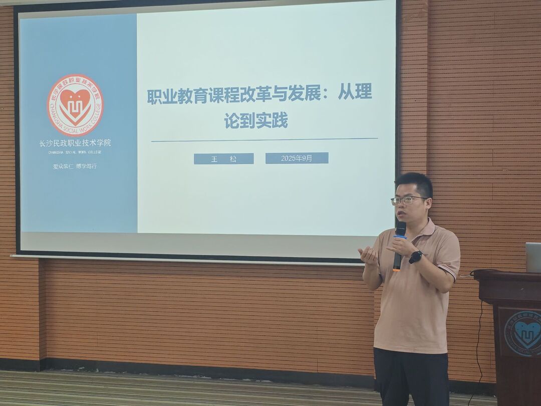 在理论指导环节,王松作《职业教育课程改革与发展:从理论到实践》主旨报告。他深入阐述了职业教育课程基于岗位需求的核心特征,系统分析了从学科式课程向模块化课程转型的改革路径,重点讲解了“课程结构与重构”的核心方法。他依据“岗位能力拆解—课程目标对应—教学内容拆分—模块重组整合”的全逻辑链,指出解构过程需聚焦实用性和关联性,重构过程需突出递进性和适配性。王松以《社区工作》课程为例,生动演示了如何将社区工作的三大岗位能力解构为具体知识和技能点,并重构为“基础理论+模拟实训+实战应用”三大模块的具体过程,为与会教师提供了脉络清晰、可供借鉴的方法论实践范例。