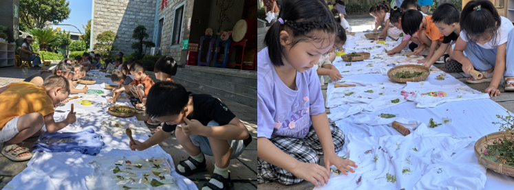 实践环节以“变废为宝”为主题。孩子们在志愿者指导下,利用旧T恤、天然落叶和安全小锤子,动手体验植物拓染。通过挑选叶片、设计图案、轻轻敲打,叶片的纹理与色彩逐渐印在衣物上,旧T恤焕然一新,成为独具特色的创意汗巾。志愿者特别说明,活动中使用的落叶后续将用于堆肥,引导孩子们理解“落叶不是垃圾,而是资源的循环利用”,亲身体验旧物重生的意义。