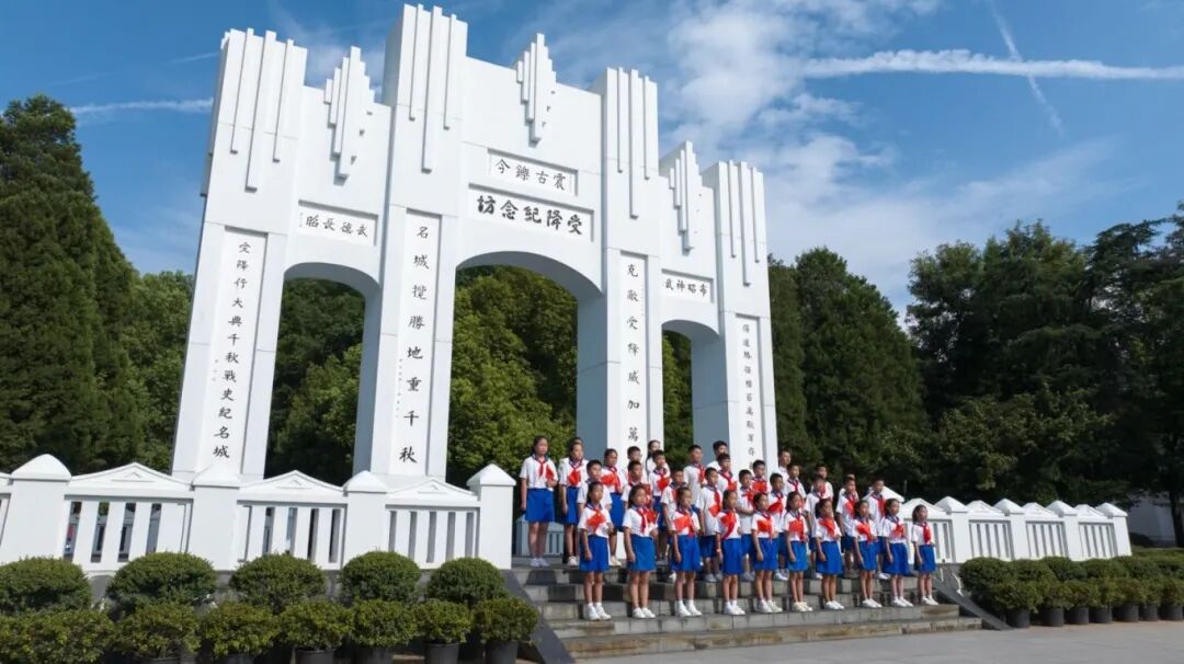 ▲芷江抗日受降纪念坊前,学生们肃立凝神,庄严缅怀。(供图:怀化市委宣传部)