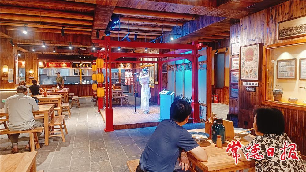 傍晚时分,店内逐渐热闹起来。顾客们点上一碗热气腾腾的米粉,配上特制的码子,酣畅淋漓地“嗦”起来。店堂内的小舞台亮起灯光,特邀的常德丝弦演员登台亮相,婉转的唱腔回荡在店堂内。这正是该店口号“嗦粉看戏,常德记忆”的真实写照。