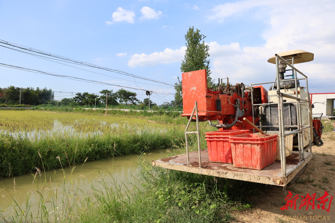 7月初,湘阴县鹤龙湖镇湘江村连片农田里,高速插秧机正穿梭作业,将嫩绿秧苗精准插入田中。
