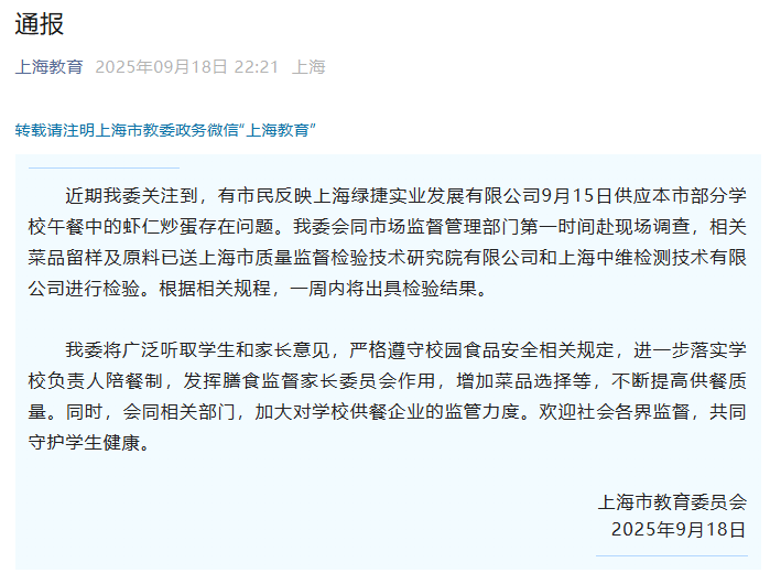 近期我委关注到,有市民反映上海绿捷实业发展有限公司9月15日供应本市部分学校午餐中的虾仁炒蛋存在问题。我委会同市场监督管理部门第一时间赴现场调查,相关菜品留样及原料已送上海市质量监督检验技术研究院有限公司和上海中维检测技术有限公司进行检验。根据相关规程,一周内将出具检验结果。