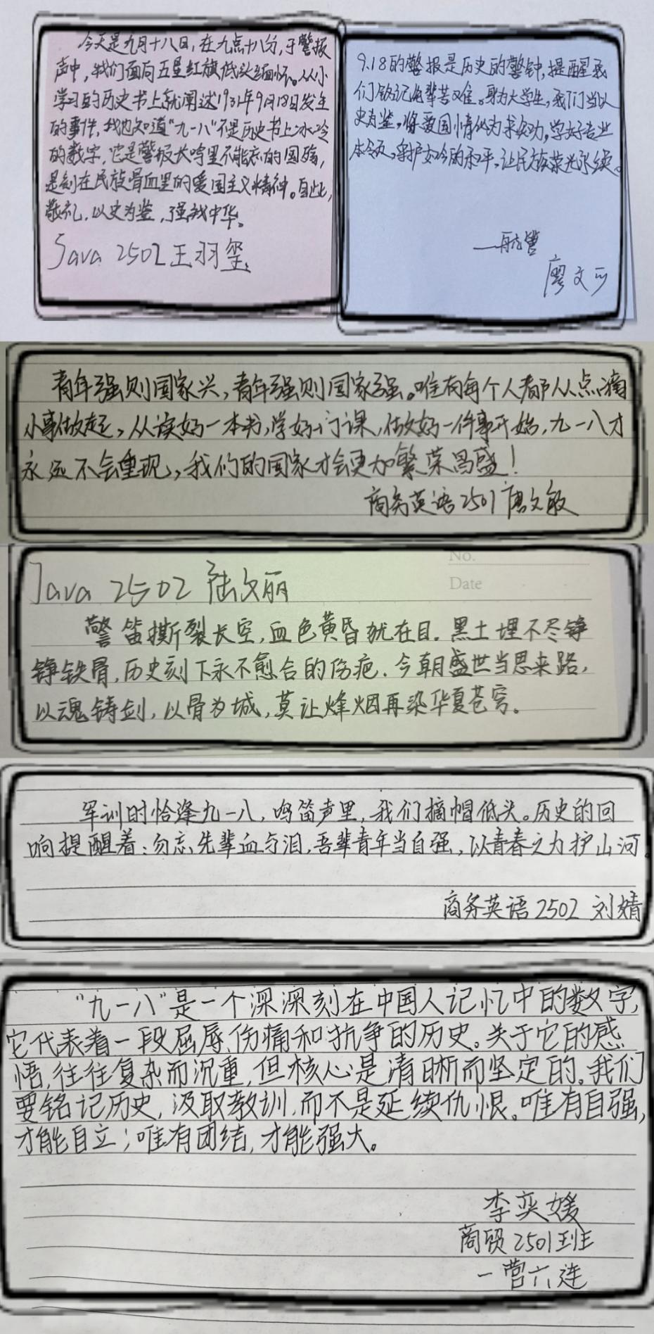 随后,同学们聆听了“弘扬伟大抗战精神 做光荣自豪中国人”思政课,系统学习抗战精神的内涵与时代价值。课后,同学们在纪念卡片上写下个人感悟。“历史不能忘却,吾辈更当自强”“以青春之我,守护盛世中华”等真挚话语,传递出青年一代的历史责任感与深厚的家国情怀。