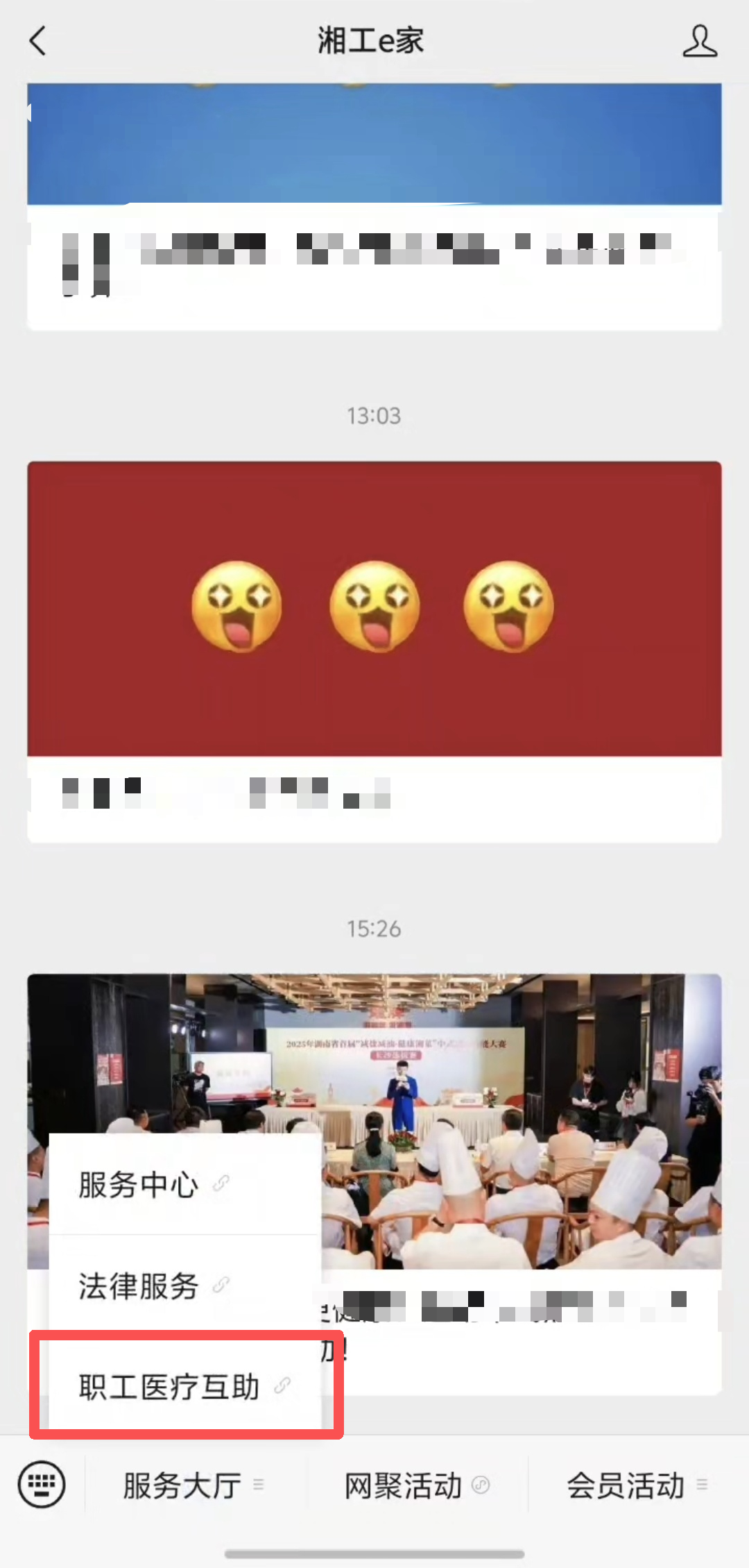 (进入《湘工e家》微信公众号,点击“服务大厅”即可看到“职工医疗互助”申报入口。)