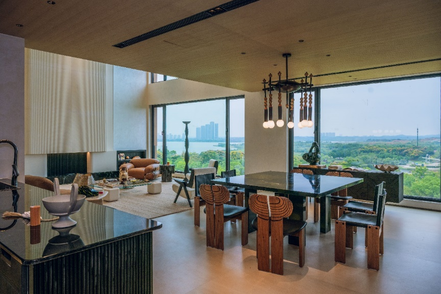 美学示范区设计独具巧思,循《千里江山图》色彩与建筑美学,与松雅湖形成地理、精神双重共鸣,打造自然与艺术交织的归家动线。界面上,汲取京都安缦“隐逸美学”,保留东方建筑韵味;归家礼制上,约5363块手工马蹄石铺路,搭配橡木屏风大门、“天圆地方”圆形中庭及约16200片琉璃瓦壁,让归家成为艺术观礼。