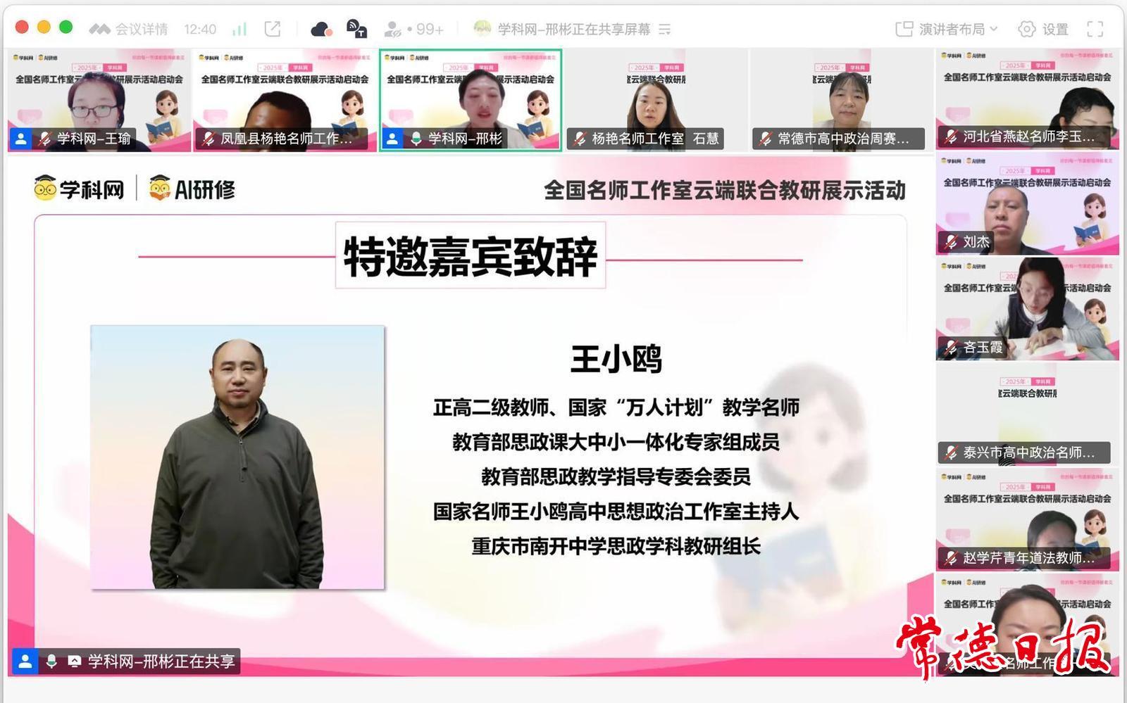 近日,由学科网主办的全国政治道法名师工作室云端联合教研展示活动正式启动,常德市第四届市级名师工作室周赛群(高中政治)名师工作室入选参加。该工作室名师与来自全国各地的31个优秀思政名师团队齐聚“云”端,共绘大中小学思政教育一体化发展的崭新蓝图。