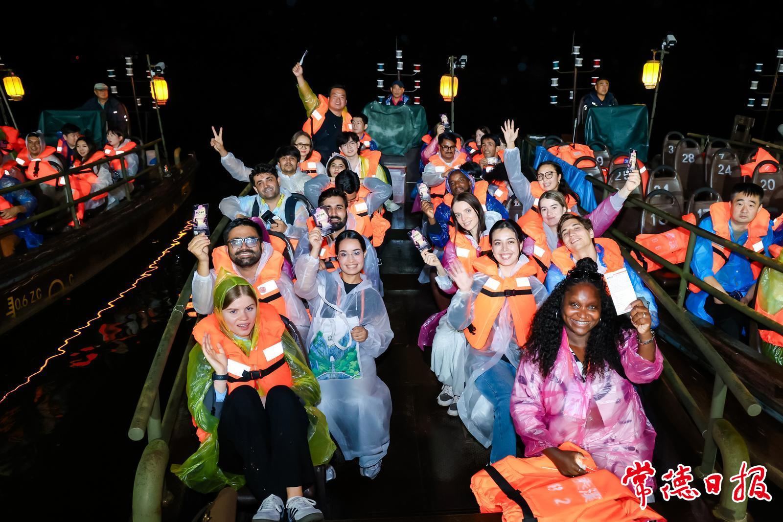 夜幕降临,达人们在秦溪五柳码头乘坐小船沿秦溪前行。以《桃花源记》为蓝本的大型溪流漫游实景演出登场,“武陵渔人”探秘境、“桃花源民”载歌载舞,灯光映衬下,达人们仿佛穿越千年。来自新加坡的博主 William 感慨:“演出太震撼,尾声漫天桃花瓣的浪漫与美好让我感动!”