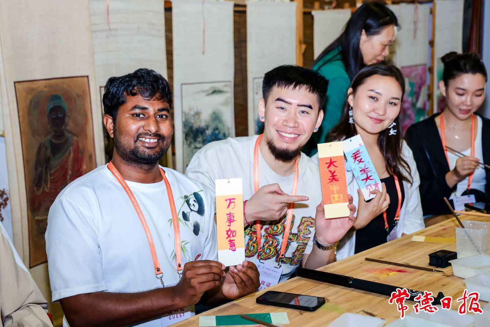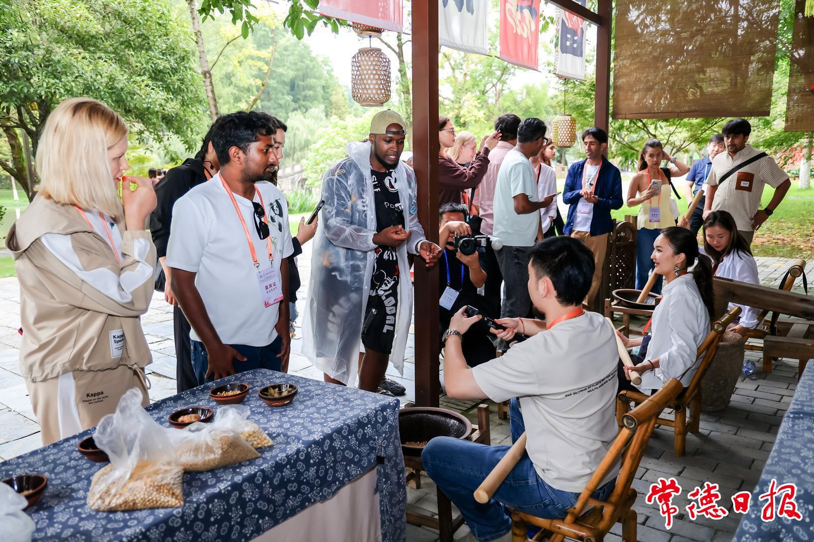 随后,达人们赴常德桃花源景区开启“寻梦世外桃源”之旅,打卡桃花山、桃源山、状元桥等标志性地点,在青石板路与茂林修竹间享受静谧。景区擂茶体验区热闹非凡,工作人员演示擂茶制作,达人们亲手研磨食材,品尝自制清甜擂茶,感受常德饮食文化韵味。来自卢旺达的旅行达人马泽,用“绝”字表达对桃花源的喜爱。