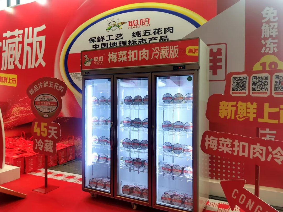 发布会上,聪厨食品董事长唐步聪亲自揭晓了行业首创产品——梅菜扣肉(冷藏版)。这款新品凭借“免解冻,18分钟上桌”的独特体验,瞬间抓住了所有人的目光,成为全场焦点。
