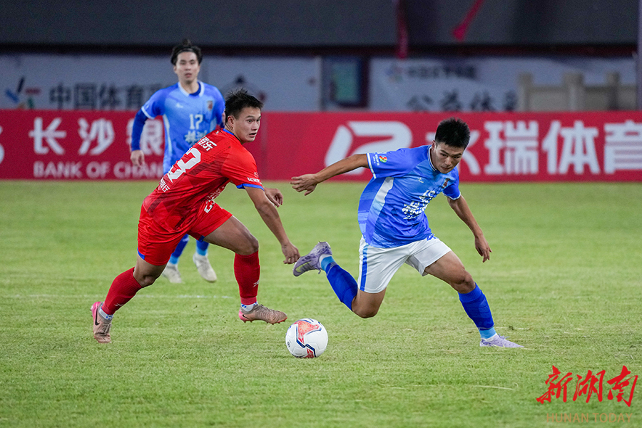 9月21日晚,张家界贺龙国际体育中心,两队球员在比赛中奋力拼抢。当天,2025湖南省足球联赛(简称“湘超”),张家界队(红)主场对阵株洲队。最终,张家界队主场以0比2的比分负于株洲队。 向韬 摄(湖南图片库)