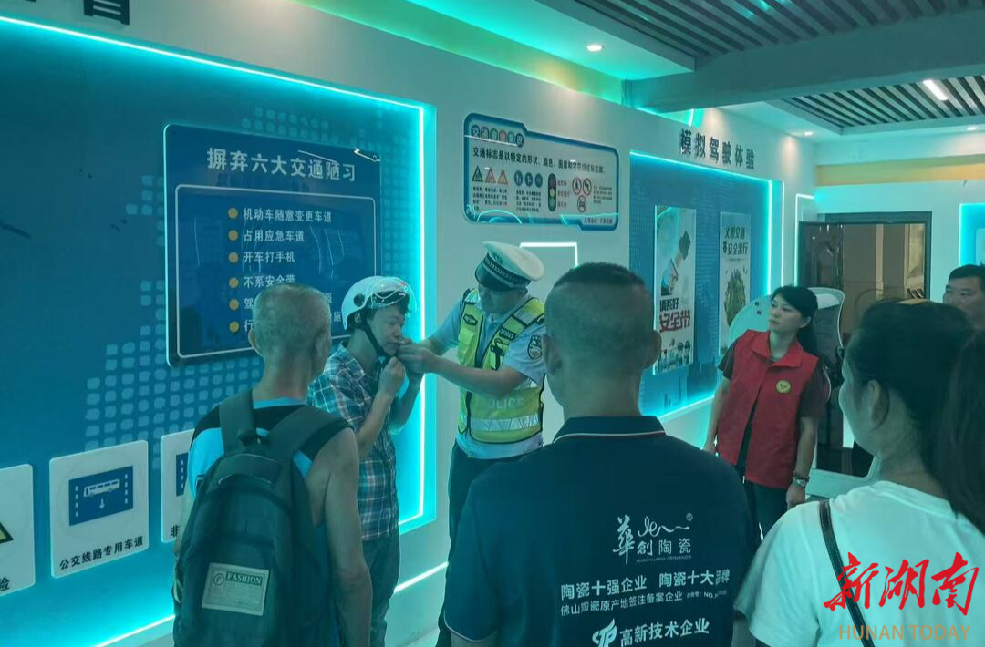 (交警大队工作人员正在示范如何正确佩戴头盔)