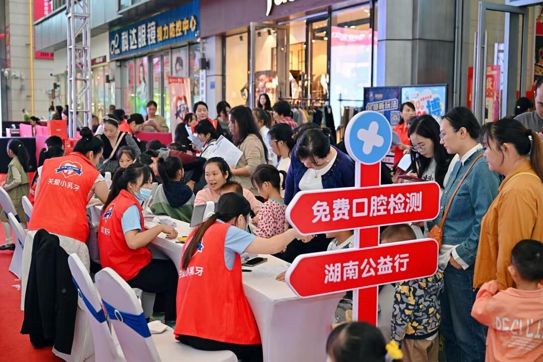 次日,公益展演活动在双峰县艺芳新天地步行街举行。现场设置了口腔检测区、知识展示区、互动游戏区及冠军妈妈郭晶晶合照打卡区四大功能区。