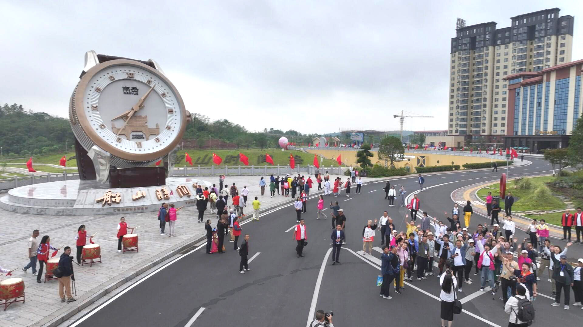 早上八点,船山时间谷钟表产业园红旗招展、锣鼓喧天,一辆辆满载东北游客的大巴缓缓驶来,该县的志愿者们整齐列队,高举欢迎牌,热情迎接每一位下车的游客。