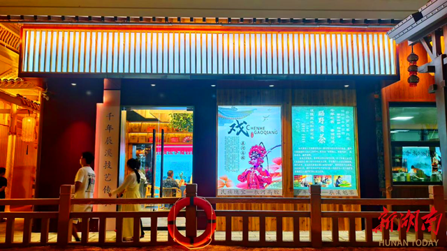 辰溪特色主题店还推出系列文创产品,包括融入高腔经典脸谱、曲词、乐器元素的茶席、杯垫、丝巾、饰品等,让古老技艺融入现代审美与实用设计。夜幕降临时,店内依然人头攒动。游客或品茗赏艺,或动手体验,或驻足聆听,细细感受辰溪千年文脉的独特魅力。