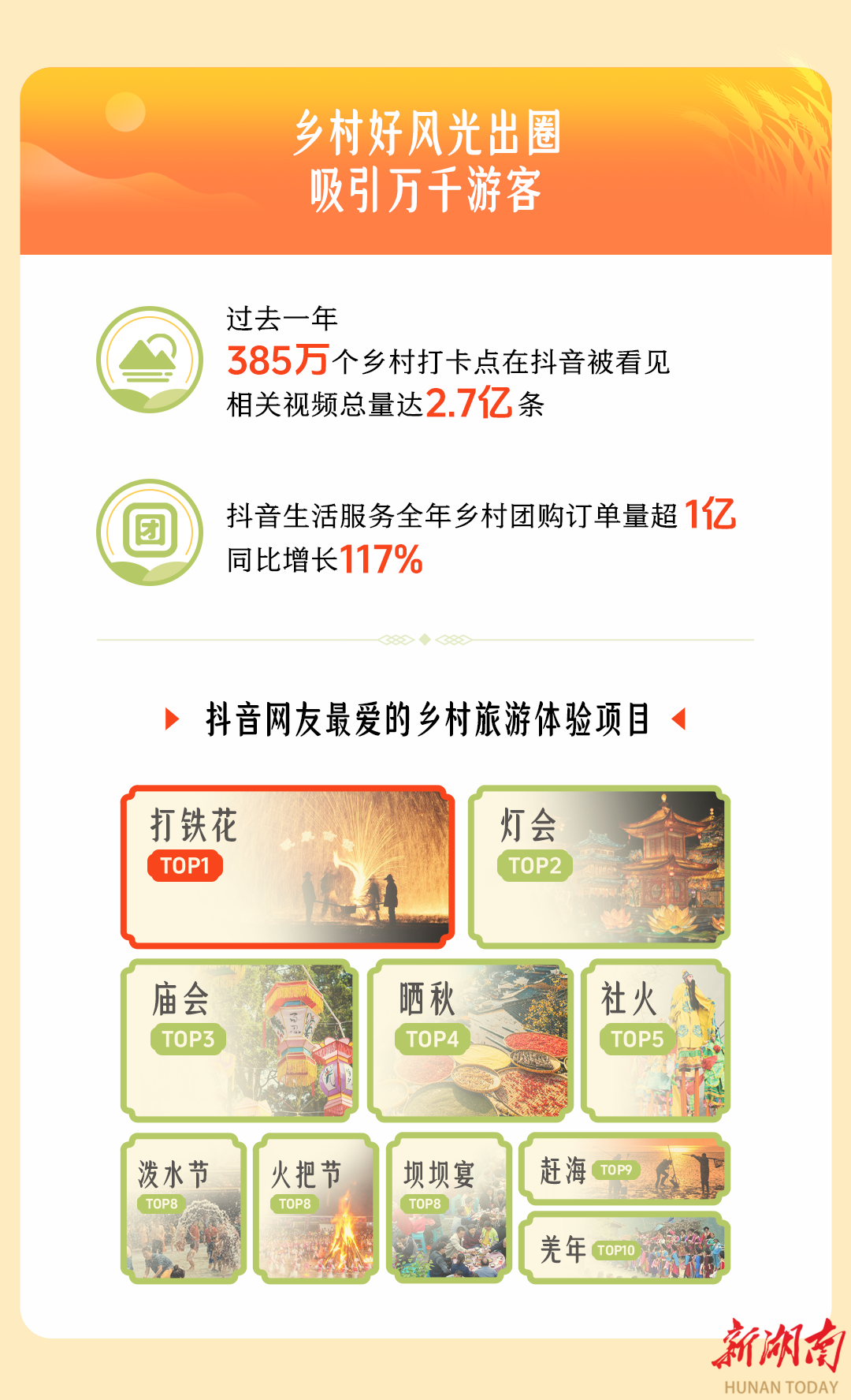 乡村美景及特色旅游资源,也借助抖音扩大影响,吸引大批网友线下“打卡”。过去一年,抖音生活服务全年乡村团购同比增长117%。丽江古城、凤凰古城、大理古城等成为深受网友喜爱的乡村景点;打铁花、灯会、庙会等乡村特色旅游项目持续走红。山西晋城司徒村、武汉木兰花乡杜堂村、安徽黄山西溪南村、广西阳朔渔村、山东杨家埠村等村落凭借民俗活动和特色项目“出圈”,有效带动当地餐饮、住宿等产业发展,为乡村振兴注入新活力。其中,在山西晋城司徒小镇,村支书@司徒老周带头用抖音作推广,带动司徒小镇的抖音团购订单在今年6-8月同比增长4倍。