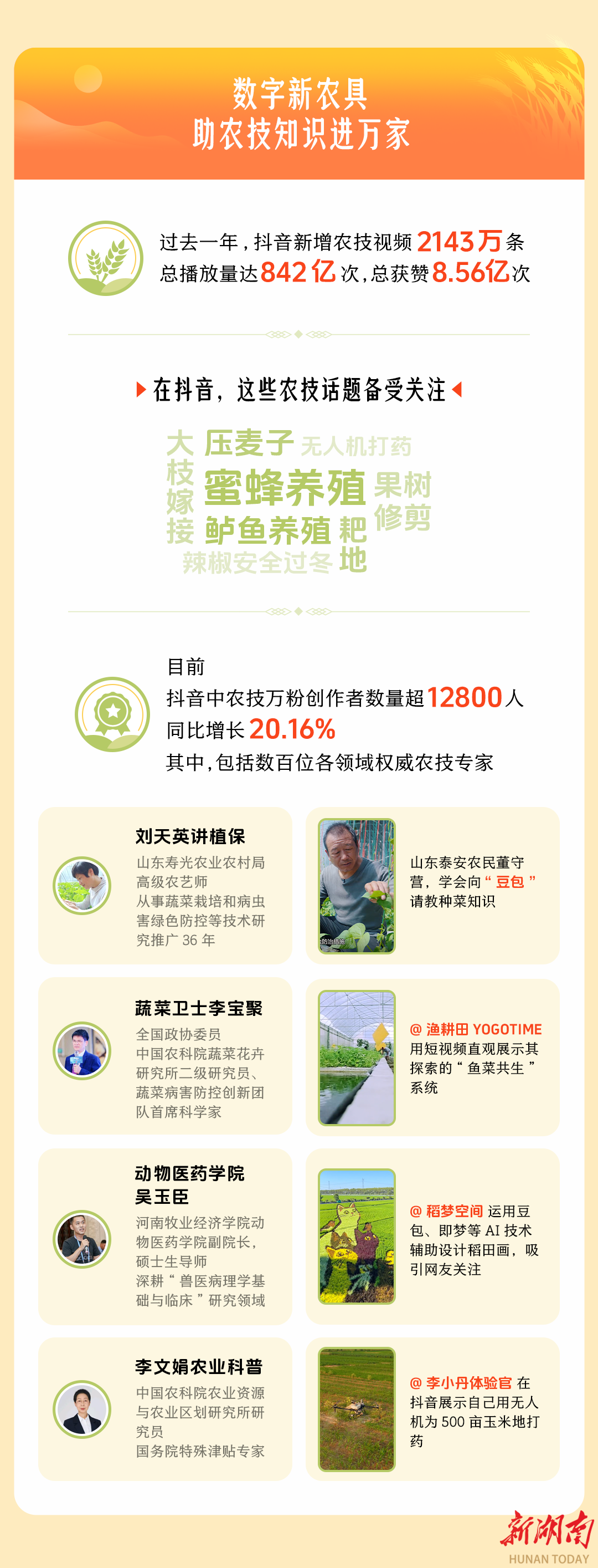 过去一年,活跃在抖音的农技类万粉创作者超1.28万人,同比增长20.16%,其中包括中国农科院研究员@蔬菜卫士李宝聚、山东寿光高级农艺师@刘天英讲植保、国务院政府特殊津贴专家@李文娟农业科普等数百位各领域权威农技专家。以李宝聚为例,作为抖音中的“乡村守护人”,他的短视频常以田间地头或实验室为背景,他说“农民需要技术,但传统的推广方式覆盖面有限。短视频能突破地域限制,让更多人受益”。