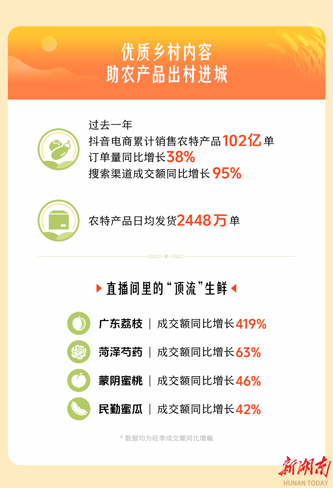 农业农村部农村经济研究中心的报告指出,兴趣电商“帮助特色农产品用市场化方式缓解淡旺季销售波动压力,减少积压和压价情况”,切实保障了农民收益。过去一年,抖音电商全年售出农特产品102亿单,日均发出产地包裹2448万个,农特产订单量同比增长38%,搜索渠道成交额增95%。
