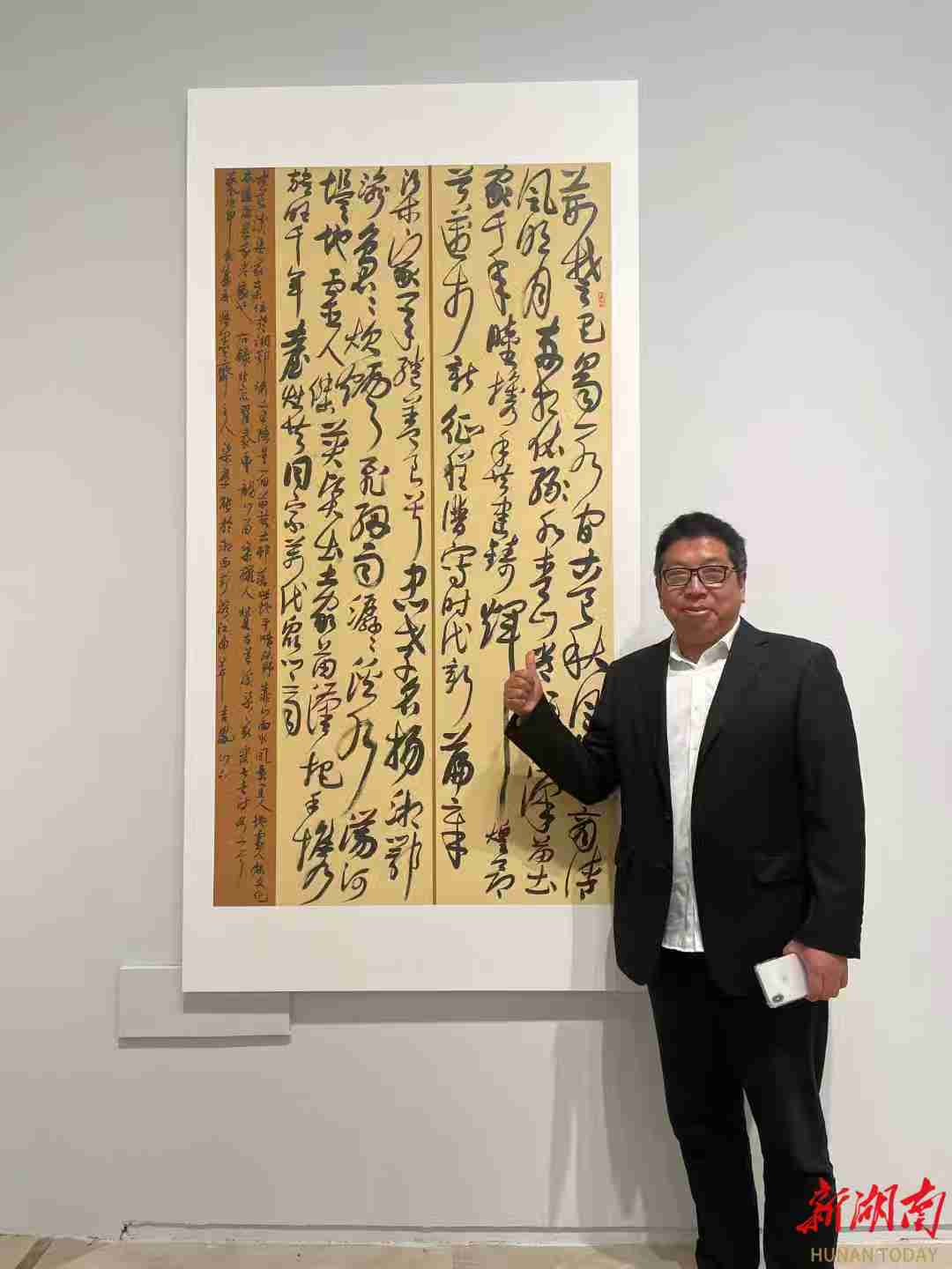 去年10月,湘西州委宣传部、州文联在上海朵云轩举办“牵风相见——湘西艺术展”,那是湘西艺术首次面向全国的高水平集体展示,一时惊艳上海滩。厚能的一幅六尺整张草书作品参展。在展厅里,我发现他的作品非常抢眼,于是在在他作品前留影后发给他。他见后,惊奇地问:“田老师您也去参观了?您喜欢吗?若真喜欢,待展完后赠送给您。”我说:“这当然求之不得啊!”到现在,该作品因故还没有退回他的手中。怕我等不急,他又另外精心创作了一幅同款作品赠送与我。