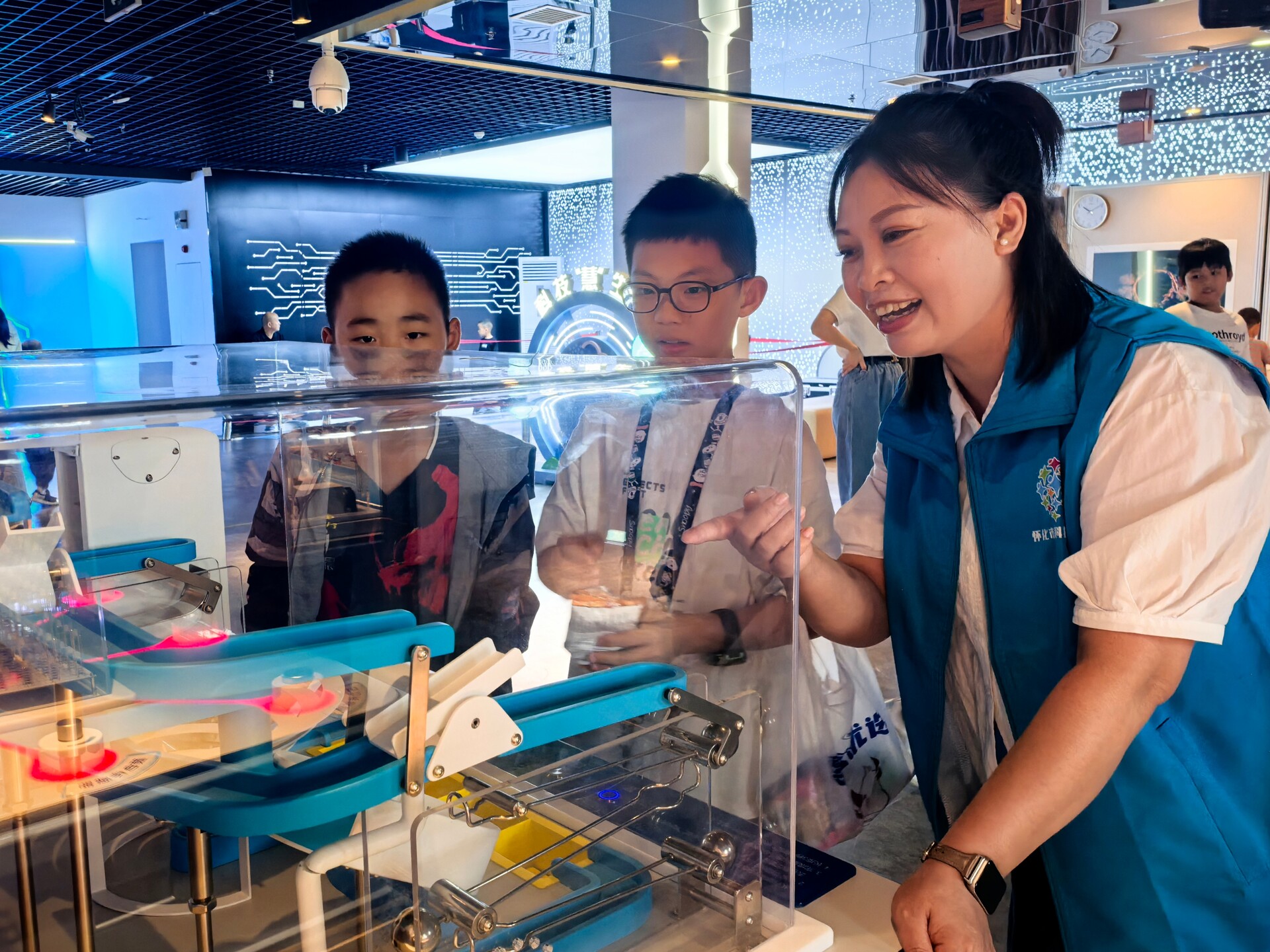靖州科技馆每周三至周日开馆运营,以“我们选择的未来”“玩美视界”“科技慧生活”“机器人展示”四大板块为核心,创新采用“文化 + 科普”互动模式,展示60余件互动展品,为青少年搭建“零距离”触摸高科技的平台。