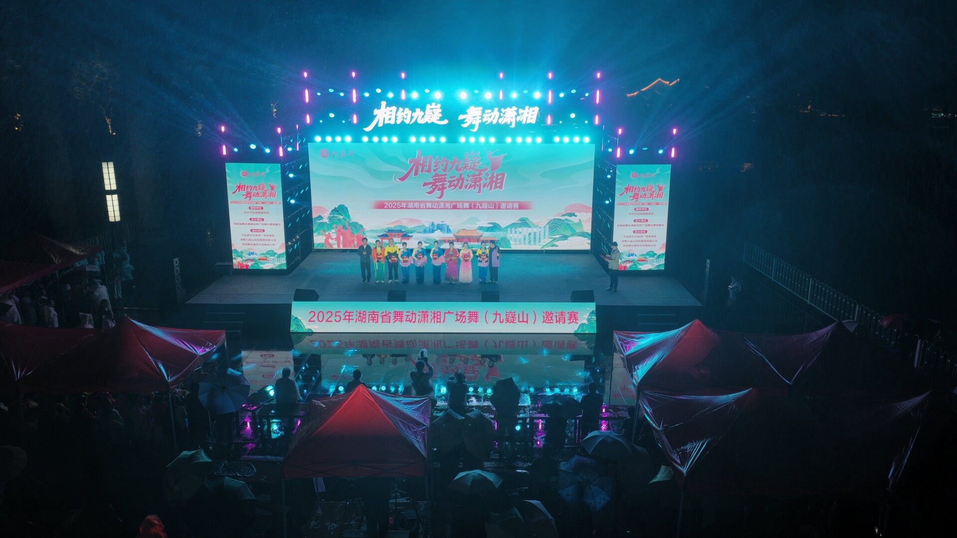 比赛在《我和我的祖国》歌声中拉开帷幕,观众跟随旋律齐唱,表达了对祖国的热爱,满腔热情点燃了九嶷山的夜空。随后,34支队伍依次登场,带来风格各异的表演。