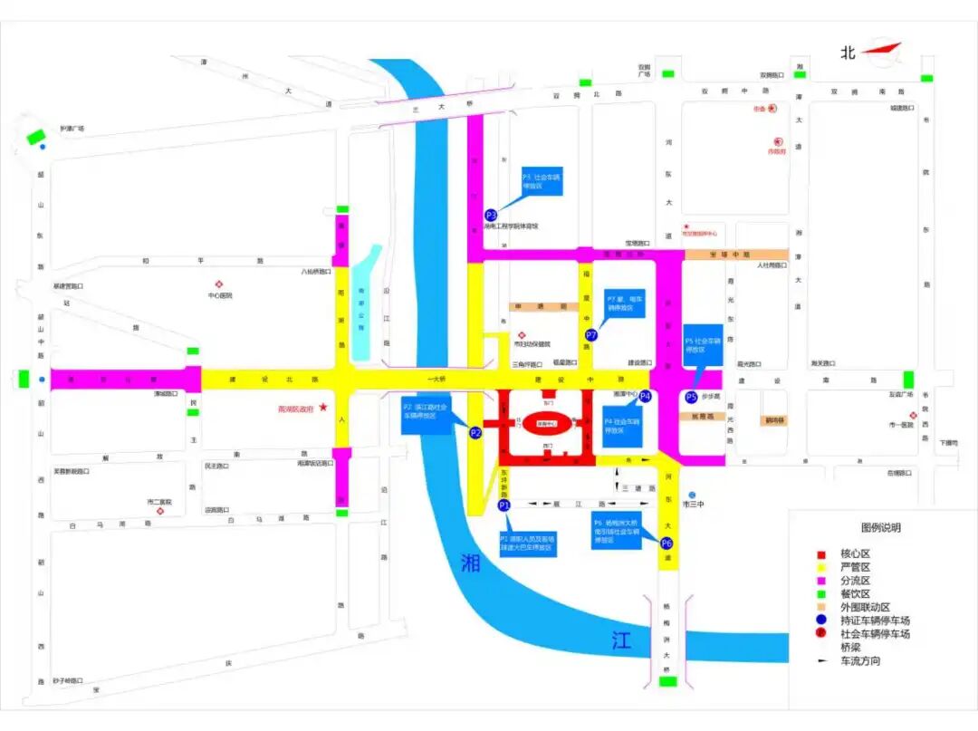 管制措施:禁止一切机动车(周边居民车辆除外)进入核心区范围,禁止一切机动车在核心区路段停放(含路内停车位)。东泗路、建设中路、福星西路、东湖路全线禁止停放摩托车、电动车。周边居民车辆请从顺江路、三塘路绕行。