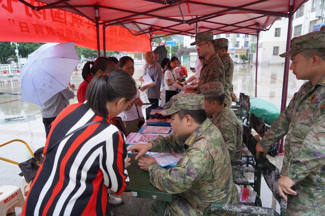 活动现场,一字排开的国防知识展板前,市民们撑着伞驻足细看,从国家安全形势到国防法律法规,图文并茂的内容让大家不时轻声交流。工作人员和志愿者,热情地向过往市民发放《国防教育读本》《征兵政策明白纸》,雨水打湿了他们的衣襟,却不影响他们向市民们宣传全民国防教育的知识。