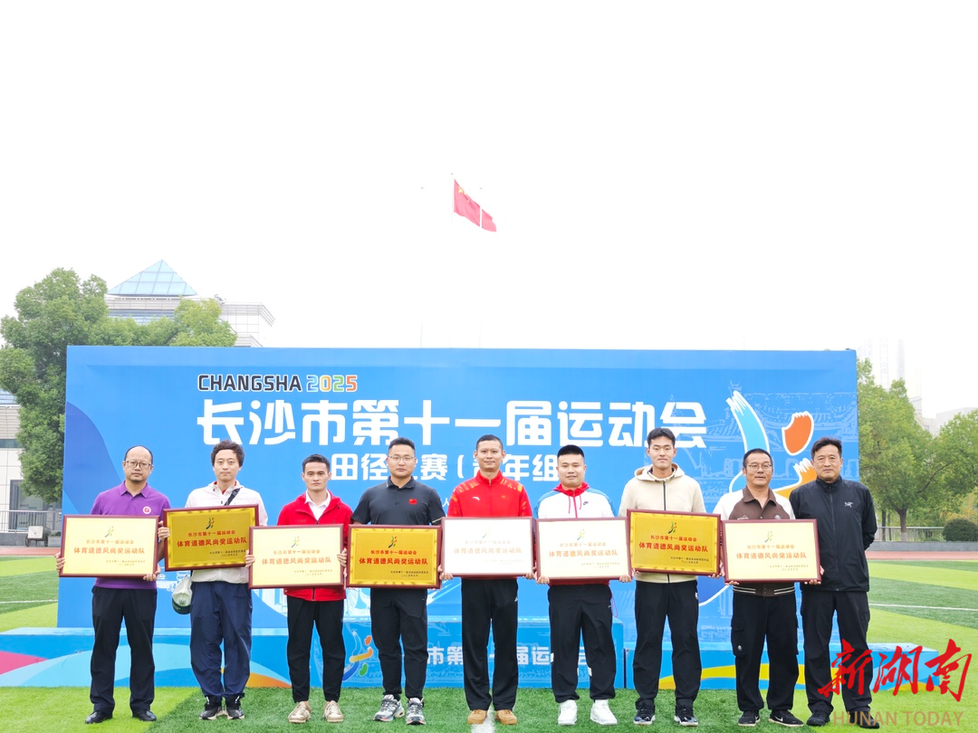 长沙县第一中学田径队(左1)获得“体育道德风尚奖运动队”。