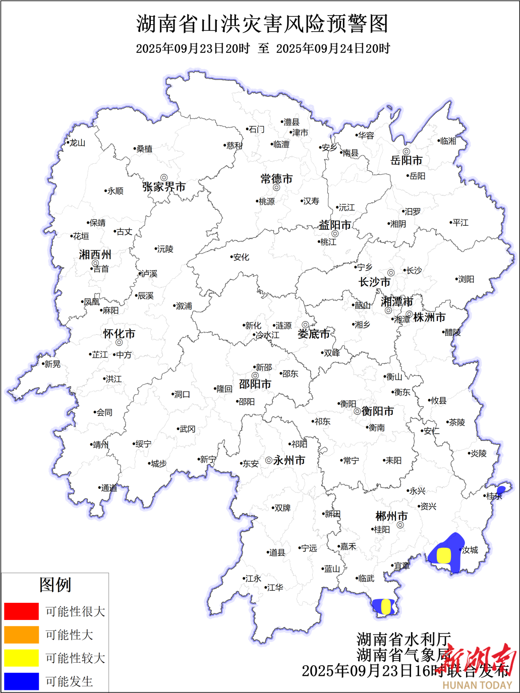 新湖南客户端9月23日讯(记者 徐丽 通讯员 周鑫 王郓瑞)根据省气象局9月23日预报,省水利厅与省气象局联合会商得出如下结论:受降雨影响,23日20:00至24日20:00,郴州市东南部、西南部等局地发生山洪灾害的可能性较大,郴州市南部局地可能发生山洪灾害。