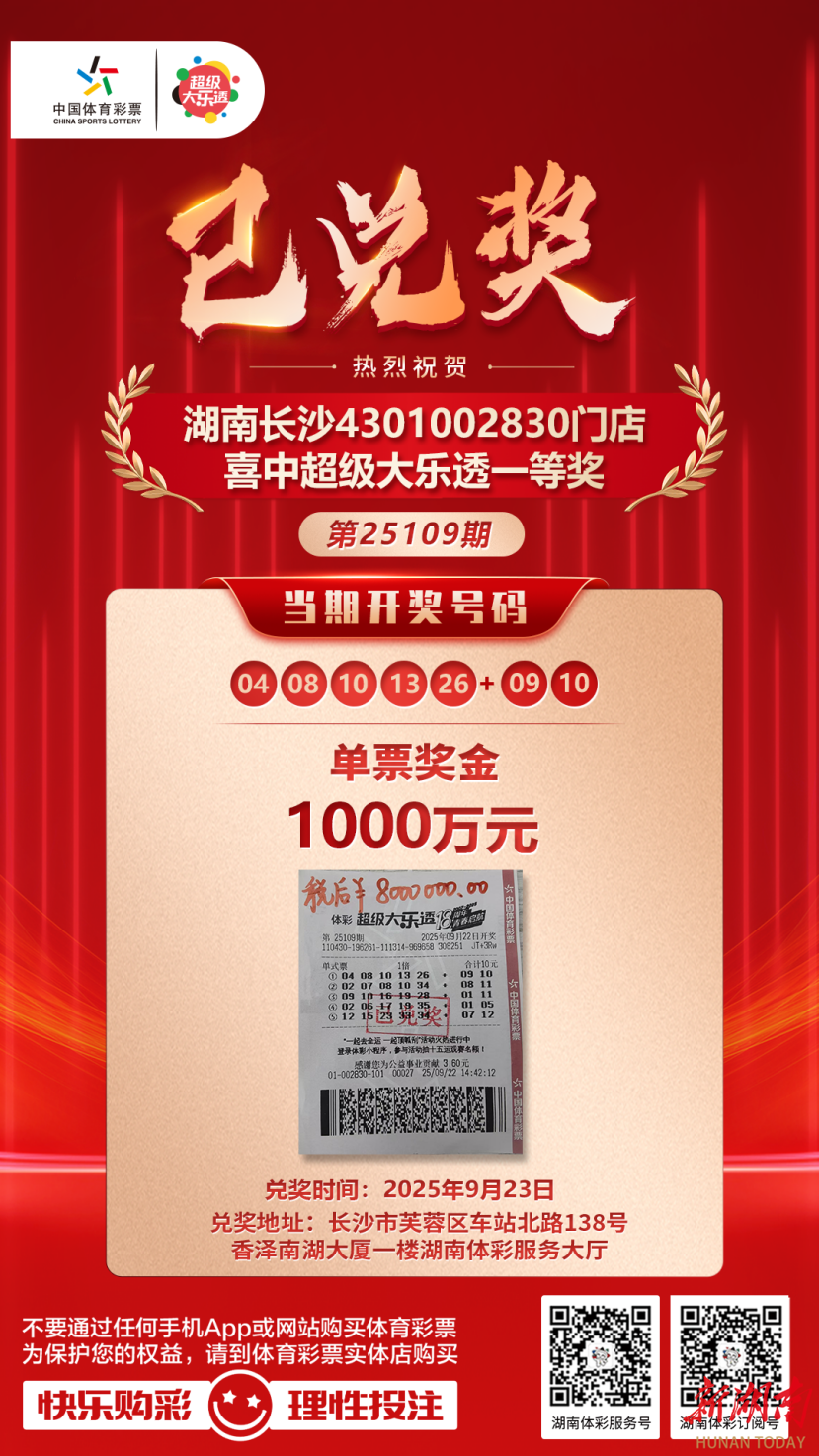 在9月22日晚开奖的超级大乐透第25109期中,全国共开出3注一等奖,本期开奖号码为前区“04、08、10、13、26”,后区“09、10”。其中湖南省长沙市凭借一张一票五注的单式票中得一注一等奖,单注奖金1000万元,税后奖金800万元。