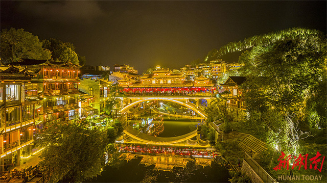 On the evening of September 22, Furong Town Scenic Area in Yongshun County was ablaze with dazzling lights, where waterfalls and ancient architecture complemented each other beautifully under the illumination. In recent years, the scenic area has developed its night economy, creating immersive nighttime experiences that have propelled the vigorous growth of its cultural and tourism industry. (Photo/Tong Zhenxi, Hunan Daily)