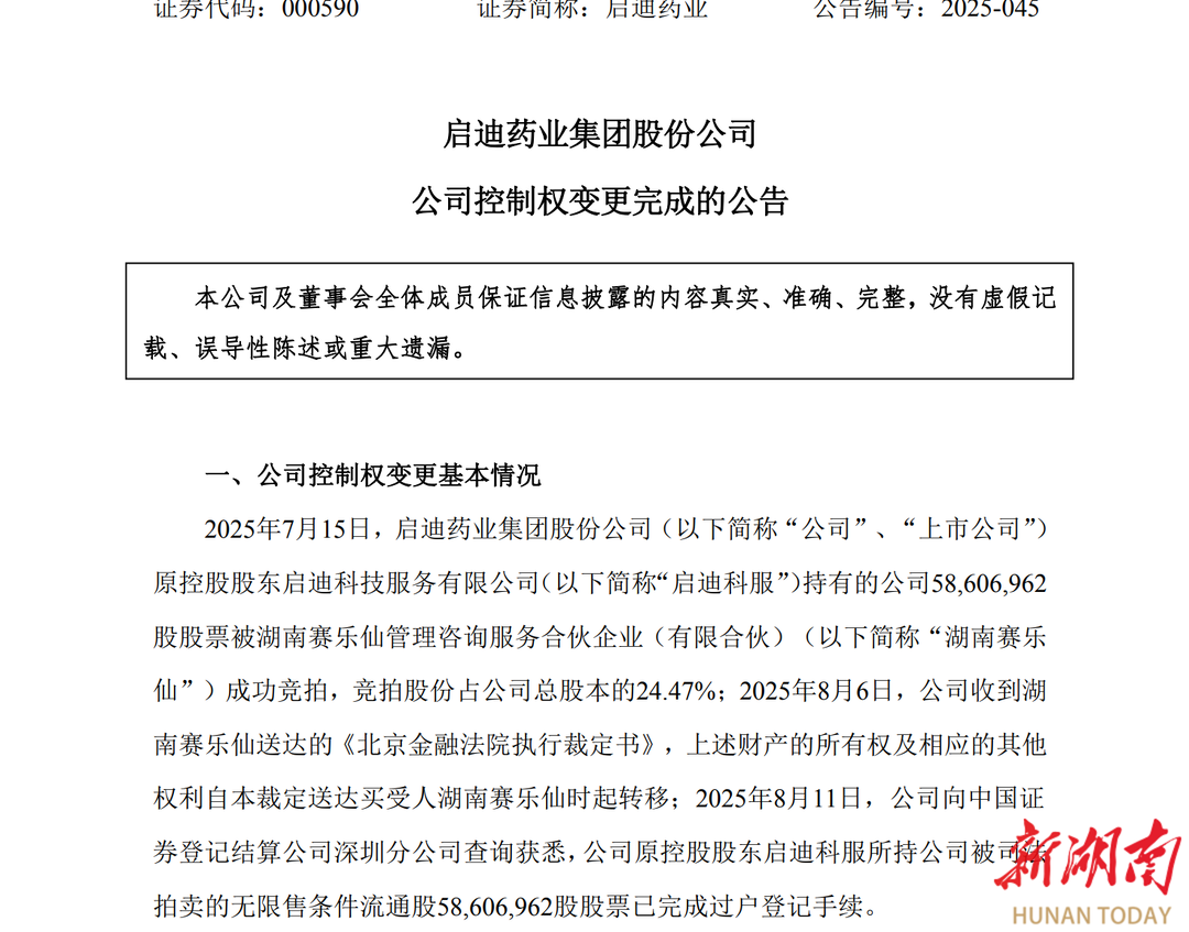 湖南日报·新湖南客户端9月24日讯(记者 刘永涛 欧阳林)备受资本市场关注的启迪药业(000590)控股权变更落地。9月23日晚,启迪药业发布公告称,公司控股权变更已顺利完成,新的控股股东为湖南赛乐仙管理咨询服务合伙企业(有限合伙),实际控制人为恒昌医药创始人兼董事长江琎。
