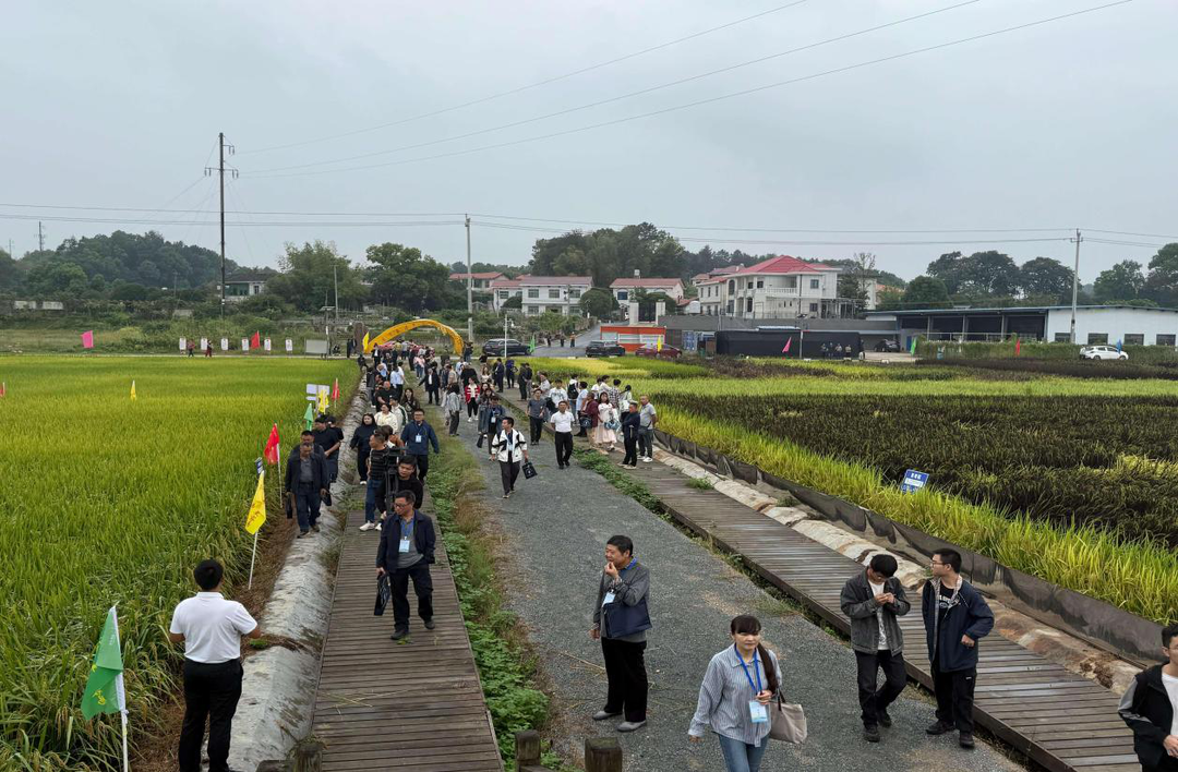 活动伊始,与会人员走进北山基地田间,实地观摩超级杂交水稻与无人机技术融合应用的生动实践。在“超级杂交水稻示范片区”,连片水稻长势良好、穗粒饱满。农技专家现场介绍了“桂香优169”“晶泰优京贵占”等主推品种的特性,包括其抗倒伏、抗病虫害的强适应性,高产稳产、米质优良的突出优势,以及适合机械化种植的特点。通过对比不同品种在株高、分蘖数、穗粒数等方面的差异,专家还分享了针对不同土壤和气候条件的最佳种植方案。