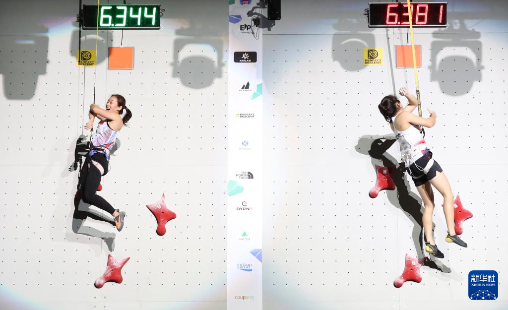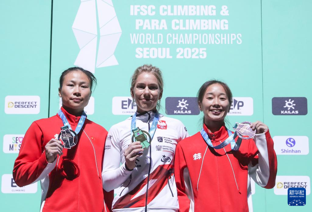 当日,在韩国首尔举行的2025年攀岩世锦赛女子速度决赛中,中国选手邓丽娟、周娅菲分获亚军和季军。