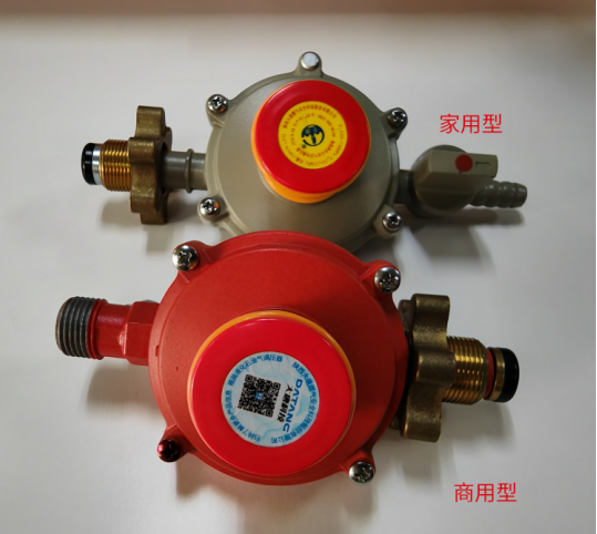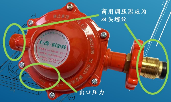 判定说明:商用调压器产品颜色为桔红色,明显位置标有“禁止家用”字样,其中家用(代号JYT)、商用(代号SYT桔红色);产品身上或说明书上标明的出口压力不得大于5.0kpa;出口连接为双螺纹;调压器压力不可调节