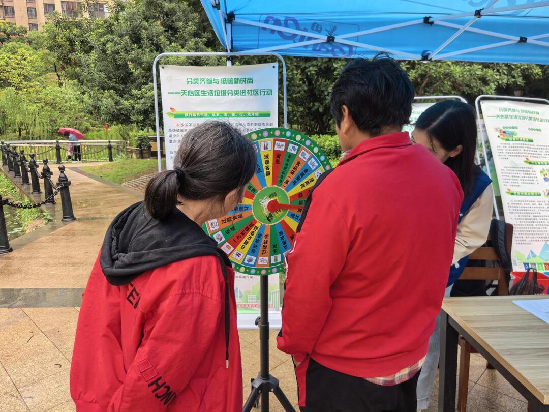 “一转就中,这垃圾分类知识学起来真有意思!”家住小区的杨娭毑在志愿者的指导下转动垃圾分类趣味转盘,根据指针指向回答对应的问题,成功赢得小礼品,脸上笑开了花,“边玩游戏边学知识,我们老人家也记得更牢。”
