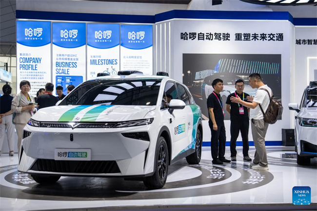 A visitor (1st R) learns about a self-driving vehicle equipped with BeiDou Navigation Satellite System (BDS) during the 4th International Summit on BDS Applications in Zhuzhou, central China's Hunan Province, Sept. 24, 2025. The 4th International Summit on BDS Applications kicked off here on Wednesday.
