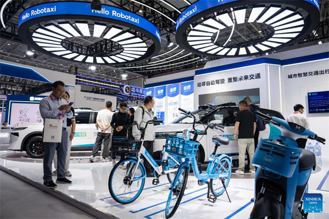 Visitors view shared bicycles equipped with BeiDou Navigation Satellite System (BDS) during the 4th International Summit on BDS Applications in Zhuzhou, central China's Hunan Province, Sept. 24, 2025. The 4th International Summit on BDS Applications kicked off here on Wednesday.