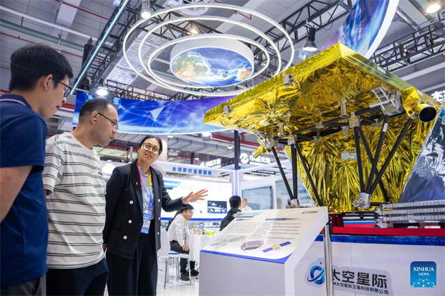 A staff member (3rd L) introduces an Earth observation satellite during the 4th International Summit on BDS Applications in Zhuzhou, central China's Hunan Province, Sept. 24, 2025. The 4th International Summit on BDS Applications kicked off here on Wednesday.