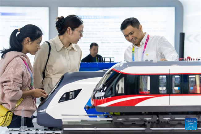 A staff member (1st R) introduces domestic EMU trains during the 4th International Summit on BeiDou Navigation Satellite System (BDS) Applications in Zhuzhou, central China's Hunan Province, Sept. 24, 2025. The 4th International Summit on BDS Applications kicked off here on Wednesday.