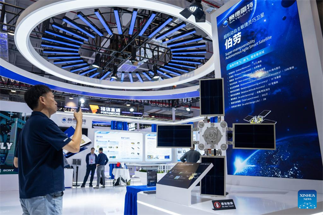 A visitor takes photos of a small artificial satellite displayed at the 4th International Summit on BDS Applications in Zhuzhou, central China's Hunan Province, Sept. 24, 2025. The 4th International Summit on BDS Applications kicked off here on Wednesday.